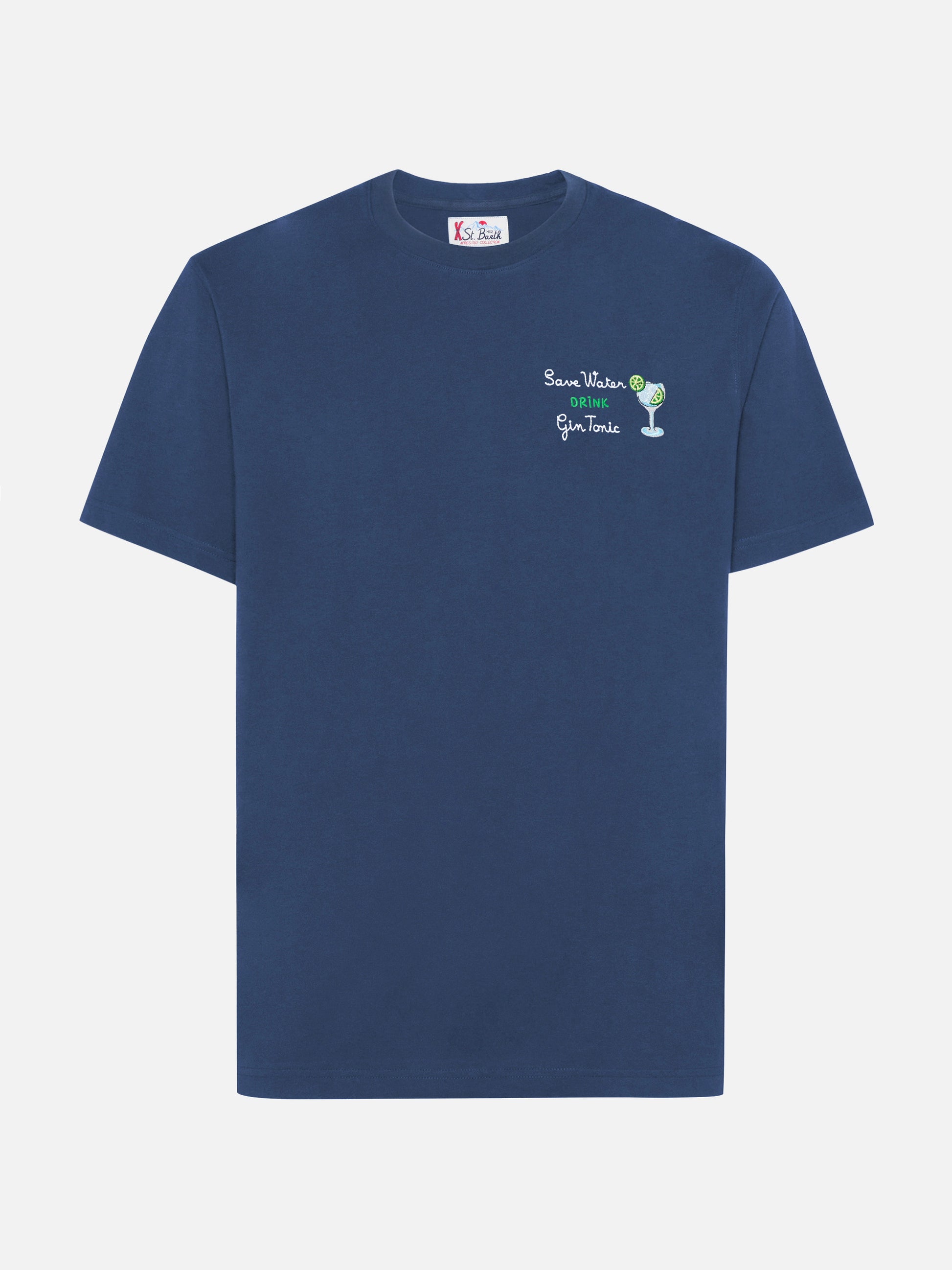 Arnott cotton T-shirt in blue with Save water drink Gin Tonic embroidery