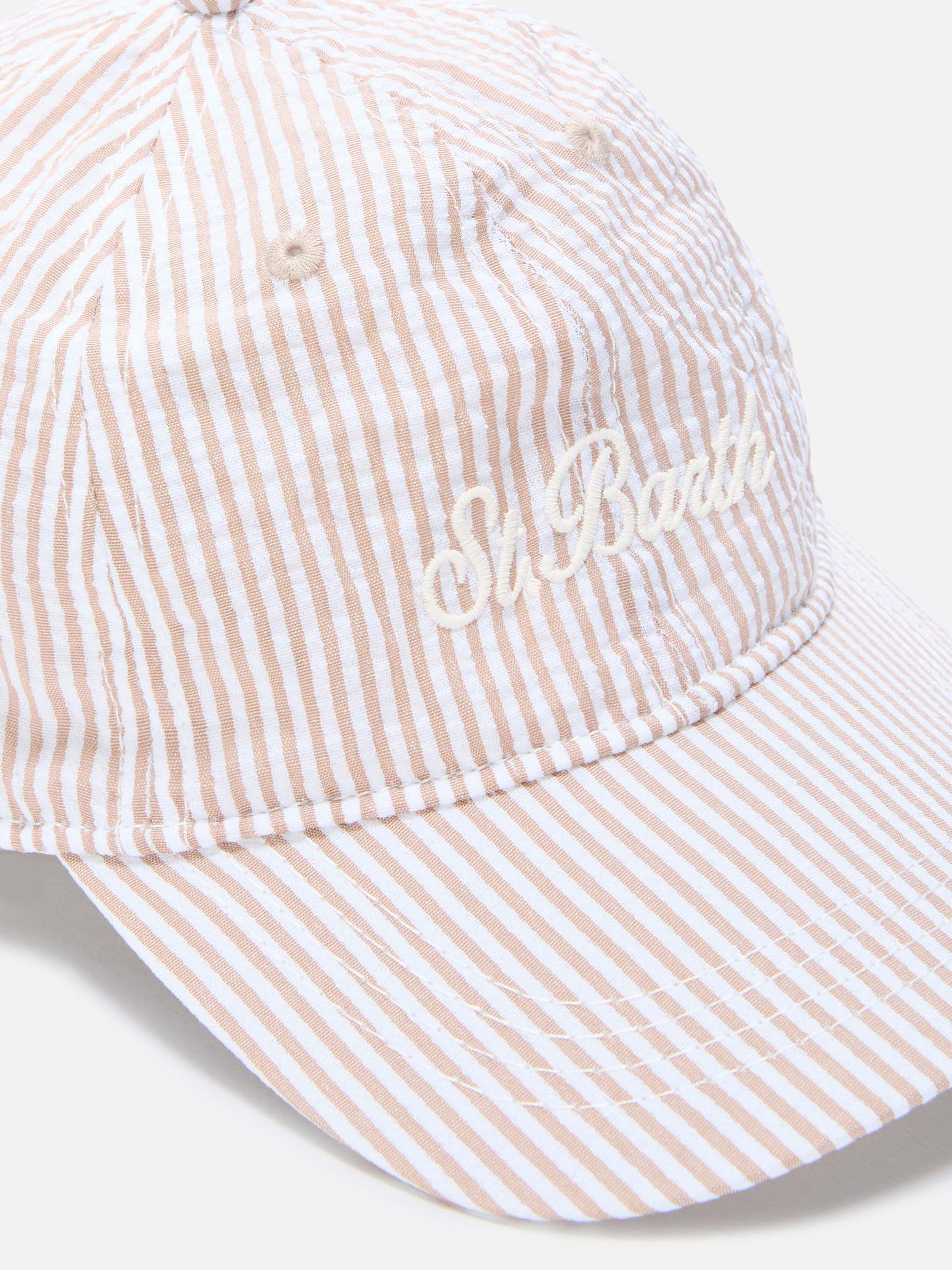 Baseball cap with visor in cotton seersucker with beige and white stripes