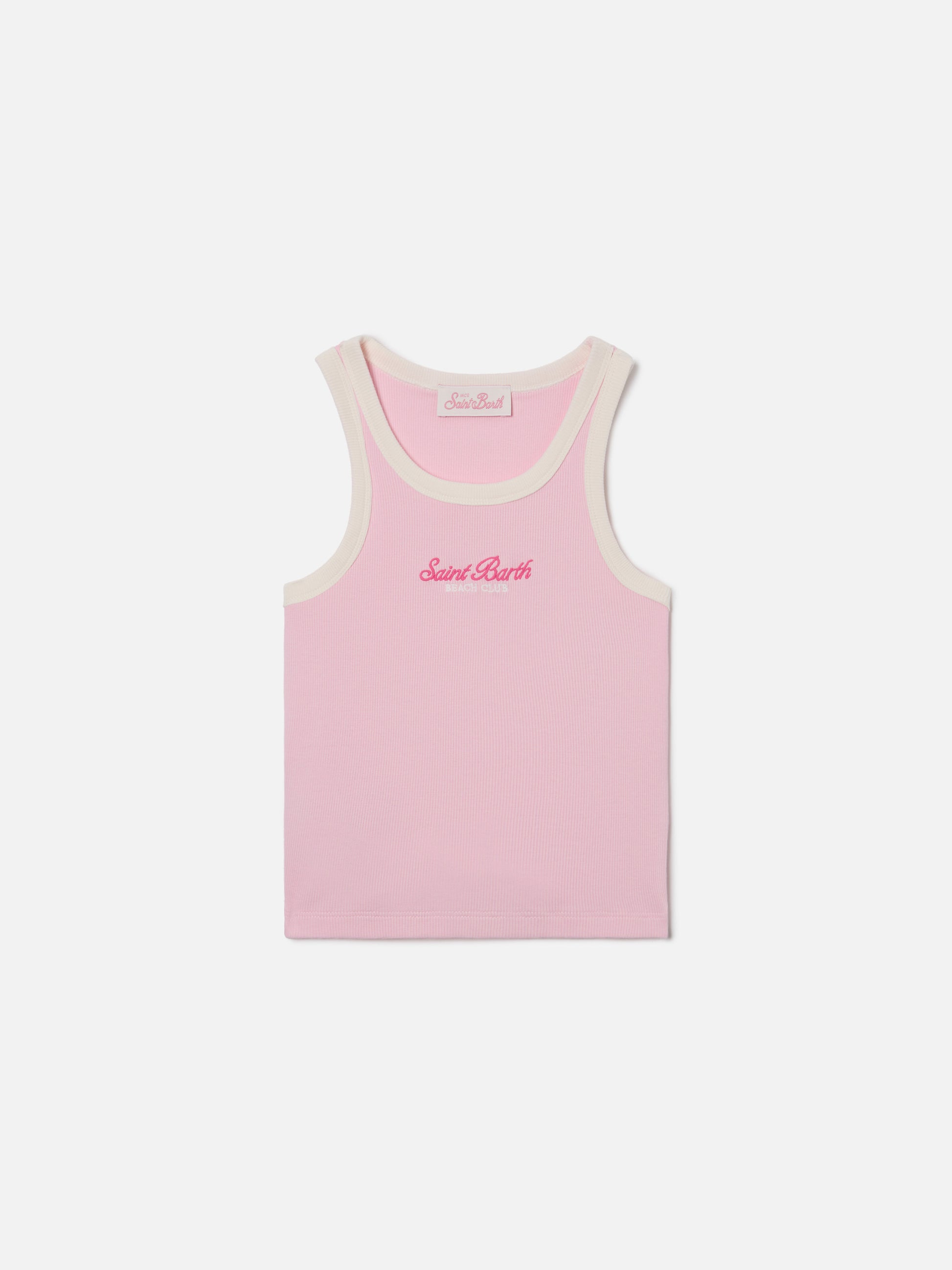 Blue Jr Tank-Top in pink with embroidered logo and cream trims