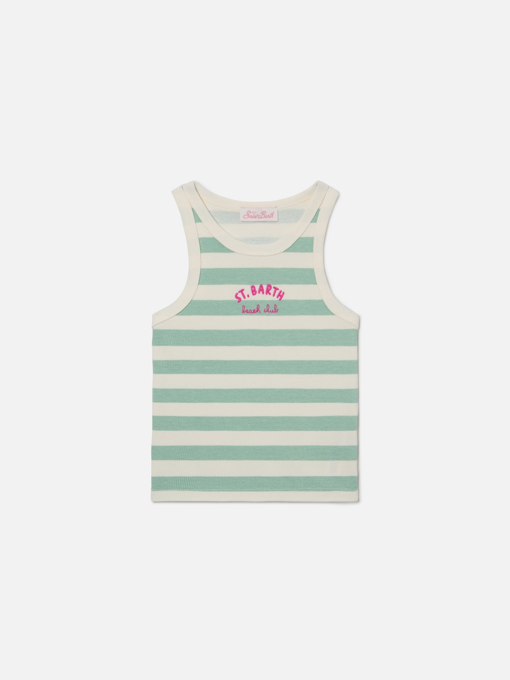 Blue Jr Tank-Top with green and white stripes and embroidered logo