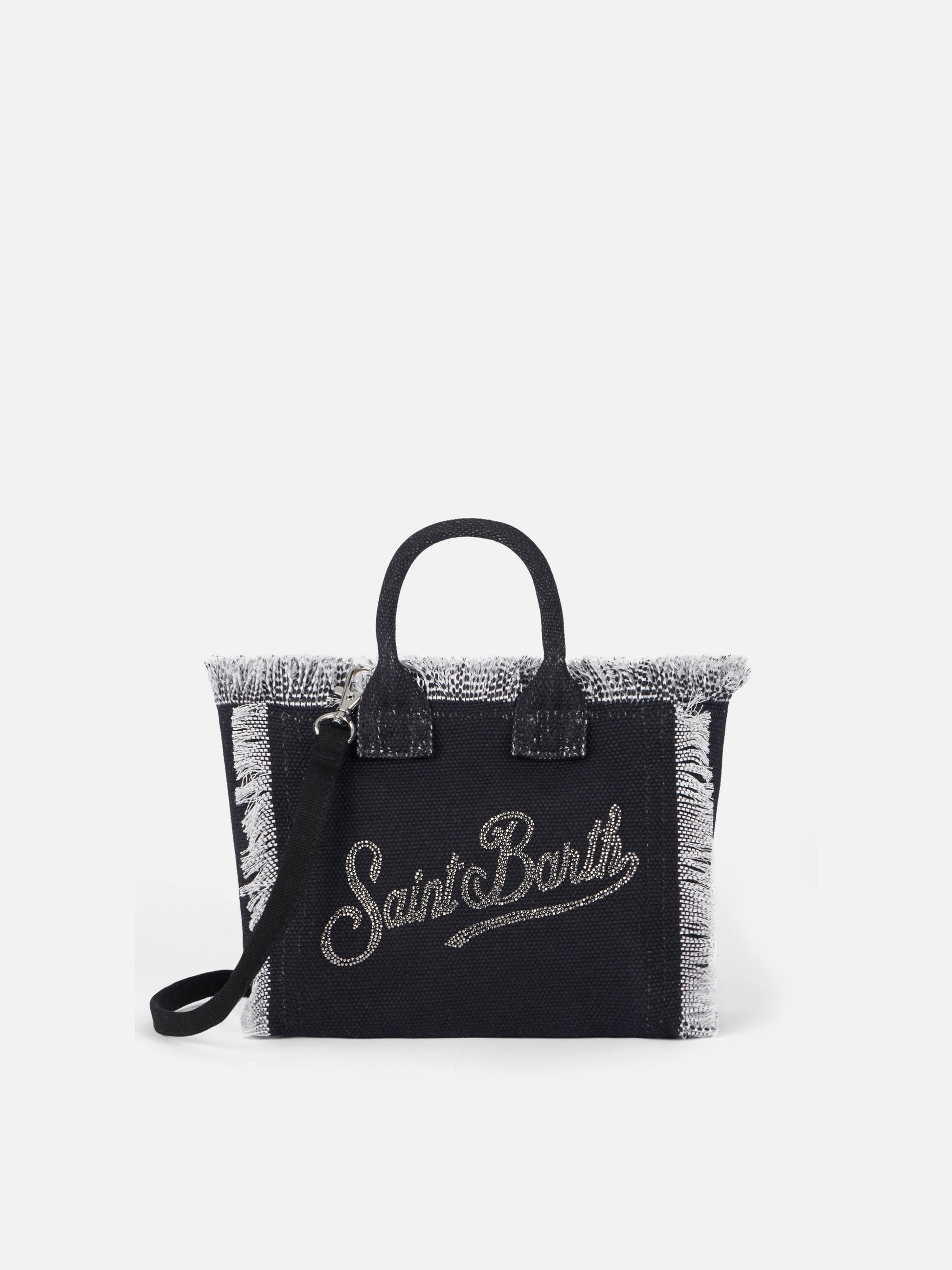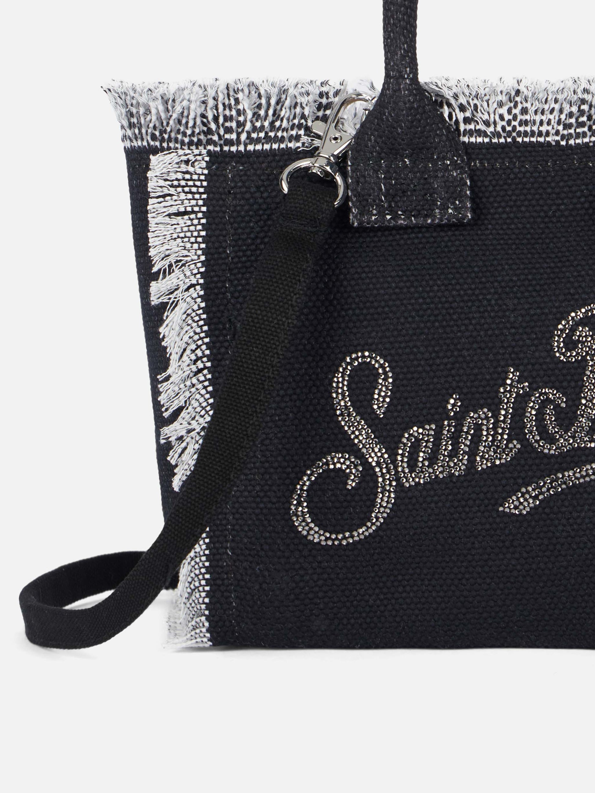 Schwarzer Baumwoll-Canvas mit exklusivem Logo aus silbernen Strasssteinen