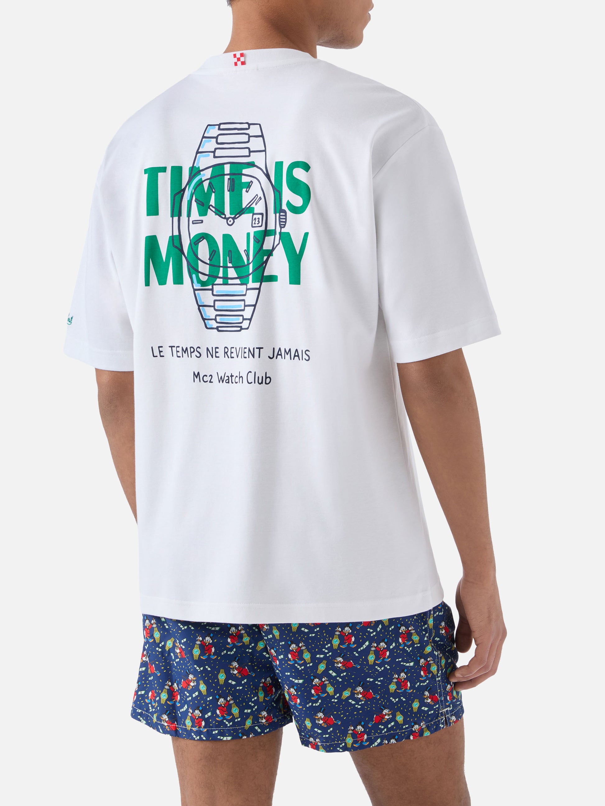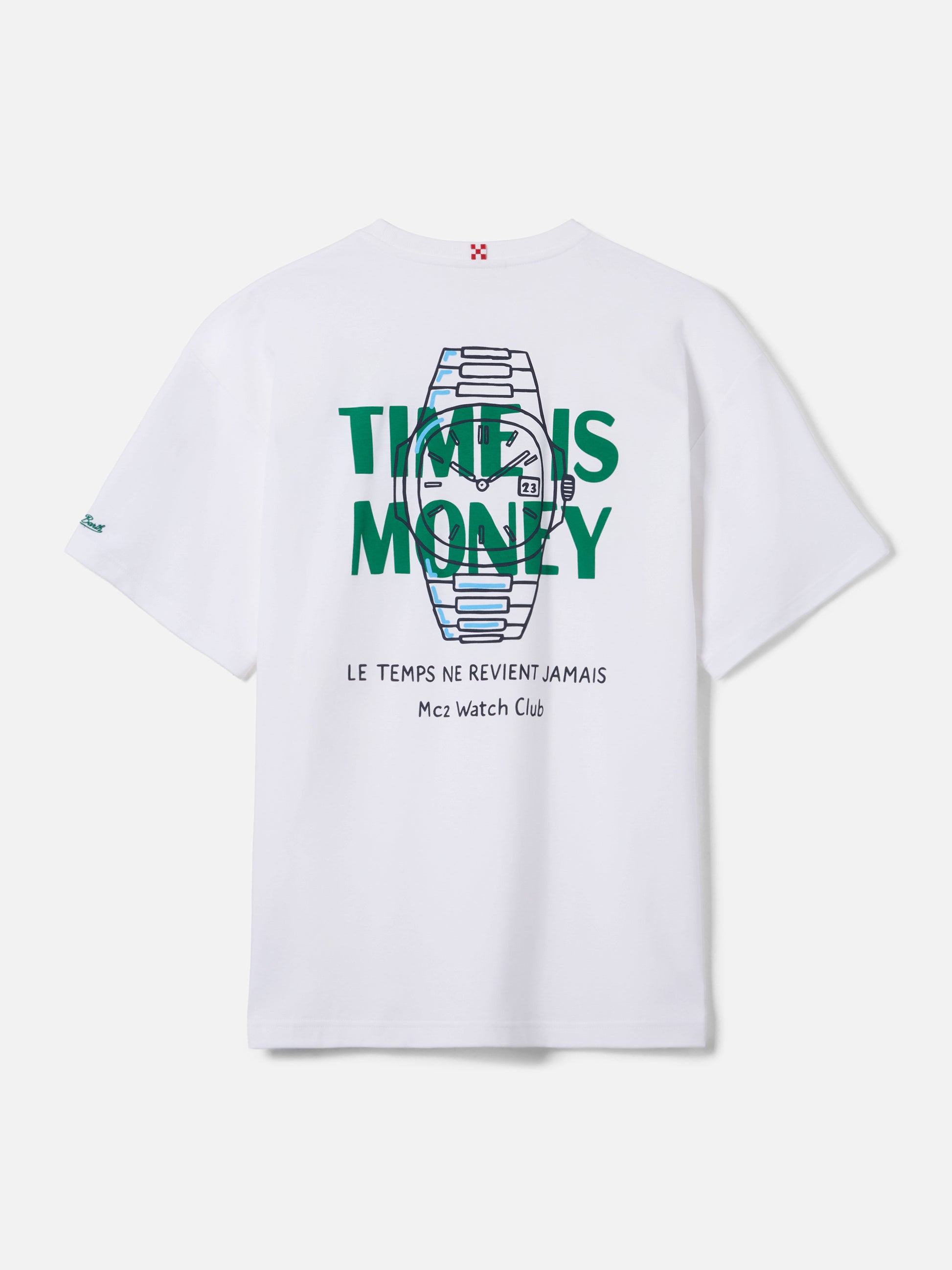 The Delmar t-shirt is crafted from pure cotton, designed to provide comfort and a natural feel against the skin. The white solid-color design highlights the essential construction of the garment. The style features a Time Is Money in St. Barth print on the chest, while the back is enriched with a large graphic print featuring a watch and the Time Is Money lettering, completed by the phrases Le temps ne revient jamais and MC2 Watch Club. The garment is finished with a crew neck, short sleeves and a straight silhouette with a relaxed fit.