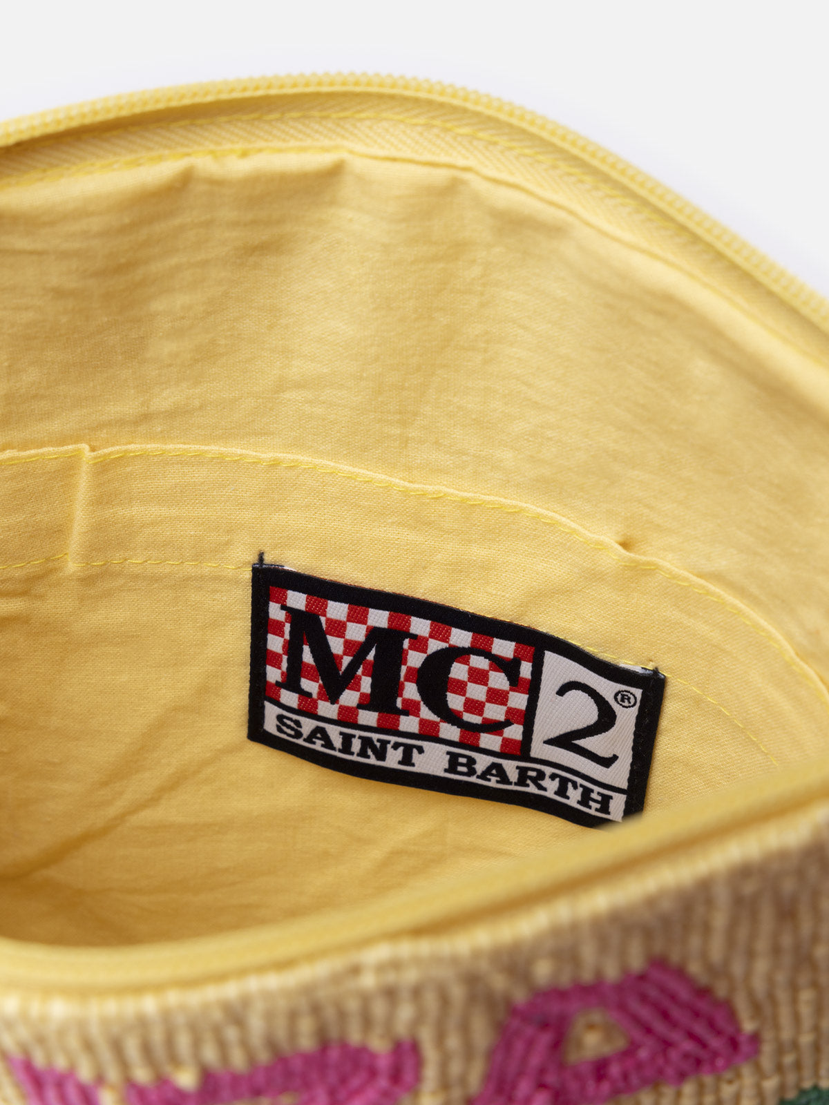 Wir stellen Ihnen unsere Pouch Pearl vor, ein bezauberndes Accessoire, das mit aufwendigen Perlenarbeiten verziert ist, die ikonische Küstenziele auf der ganzen Welt darstellen. Dieser mit viel Liebe zum Detail gefertigte Beutel verfügt über eine mit Baumwolle gefütterte Innenseite für zusätzliche Haltbarkeit und Komfort. Der Reißverschluss ist mit einer Baumwollquaste zum einfachen Öffnen und Schließen versehen. Im Inneren finden Sie eine praktische Tasche zum Organisieren Ihrer wichtigsten Utensilien. Die Rückseite ist mit einem gestickten MC2 Saint Barth-Logo auf Baumwollstoff verziert.