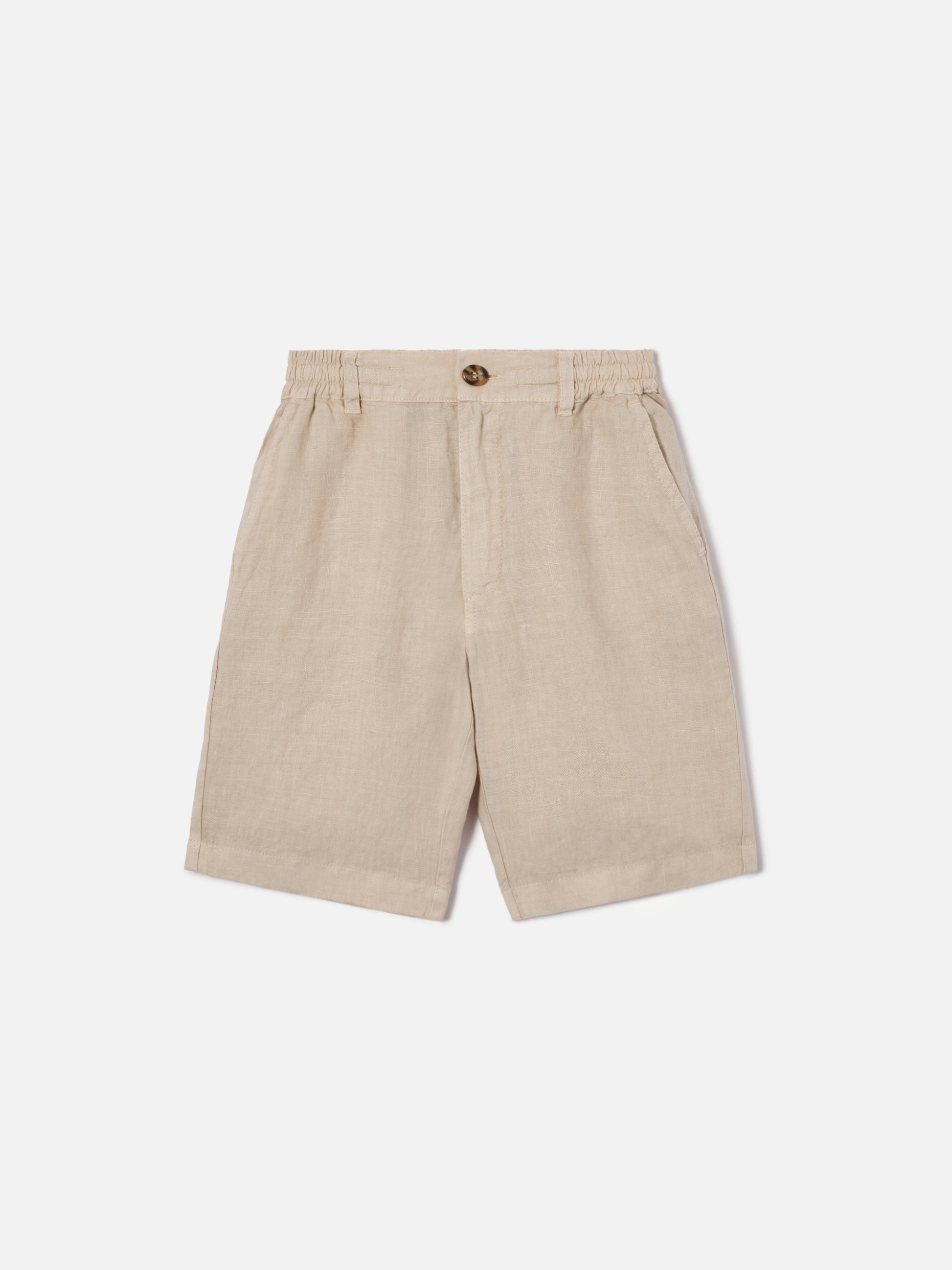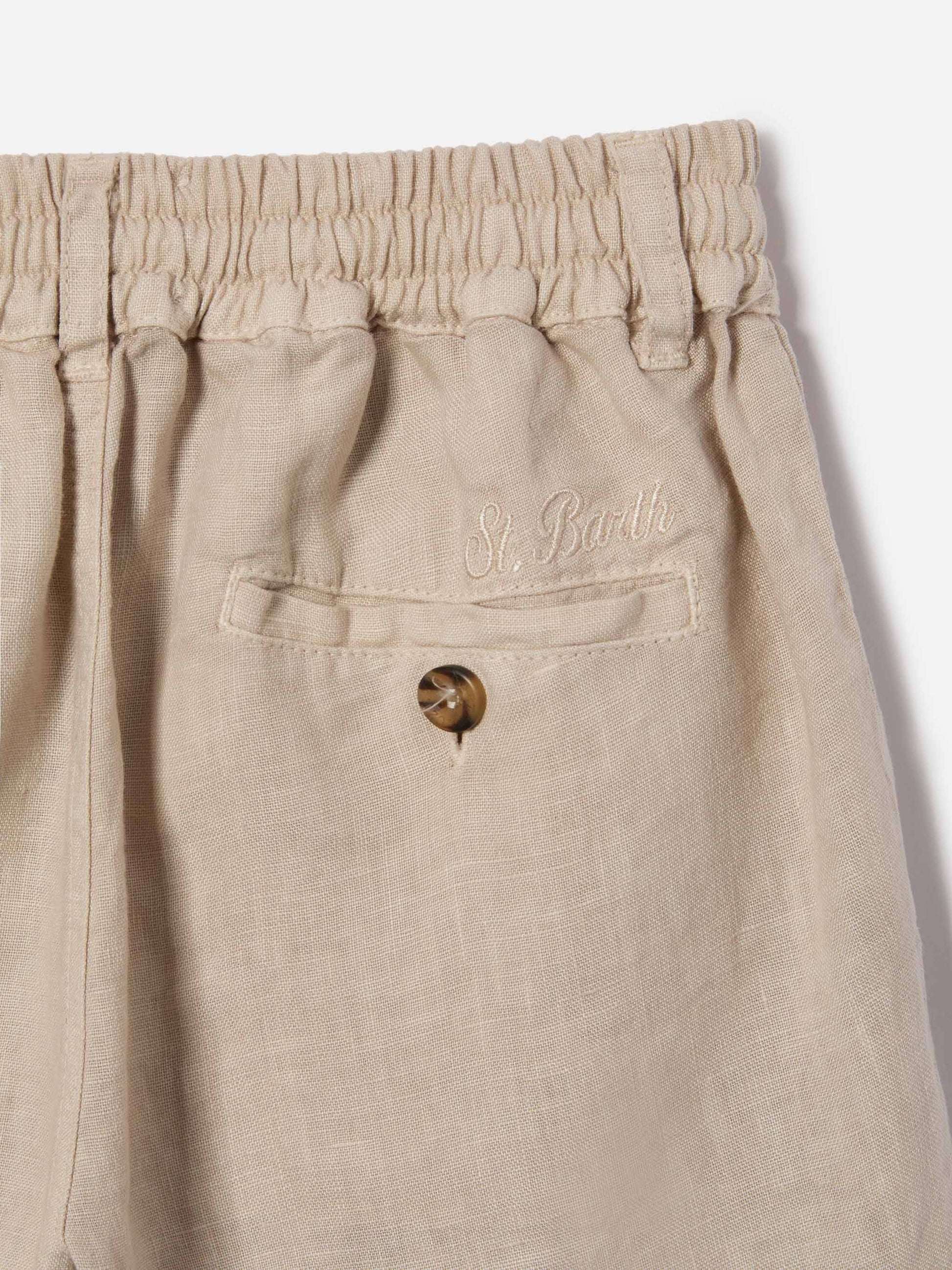 The Ischia Jr shorts for boys are made of pure linen, a lightweight and breathable fabric. The solid light grey color defines an essential and versatile aesthetic. The model features front zip and logo button closure, an elasticated waistband with adjustable inner drawstring and side pockets on the front. On the back there are welt pockets with logo button, completed by tone-on-tone St. Barth embroidery on the pocket. The clean construction ensures a regular fit.