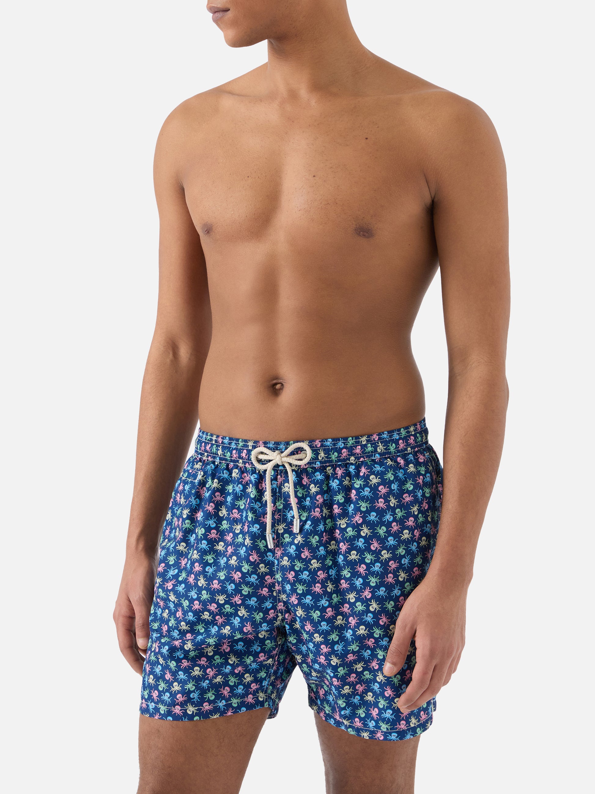 The Lighting Micro swim shorts are crafted from breathable quick-dry fabric designed to provide comfort and freedom of movement. The navy design features an all-over print with multicolour octopuses that evoke a lively and playful marine-inspired aesthetic. The elasticated waistband with drawstring allows an adjustable fit, while functional pockets and refined details complete the construction. The elasticated antibacterial inner mesh ensures comfort during wear. The style features a mid-length cut and a regular fit.