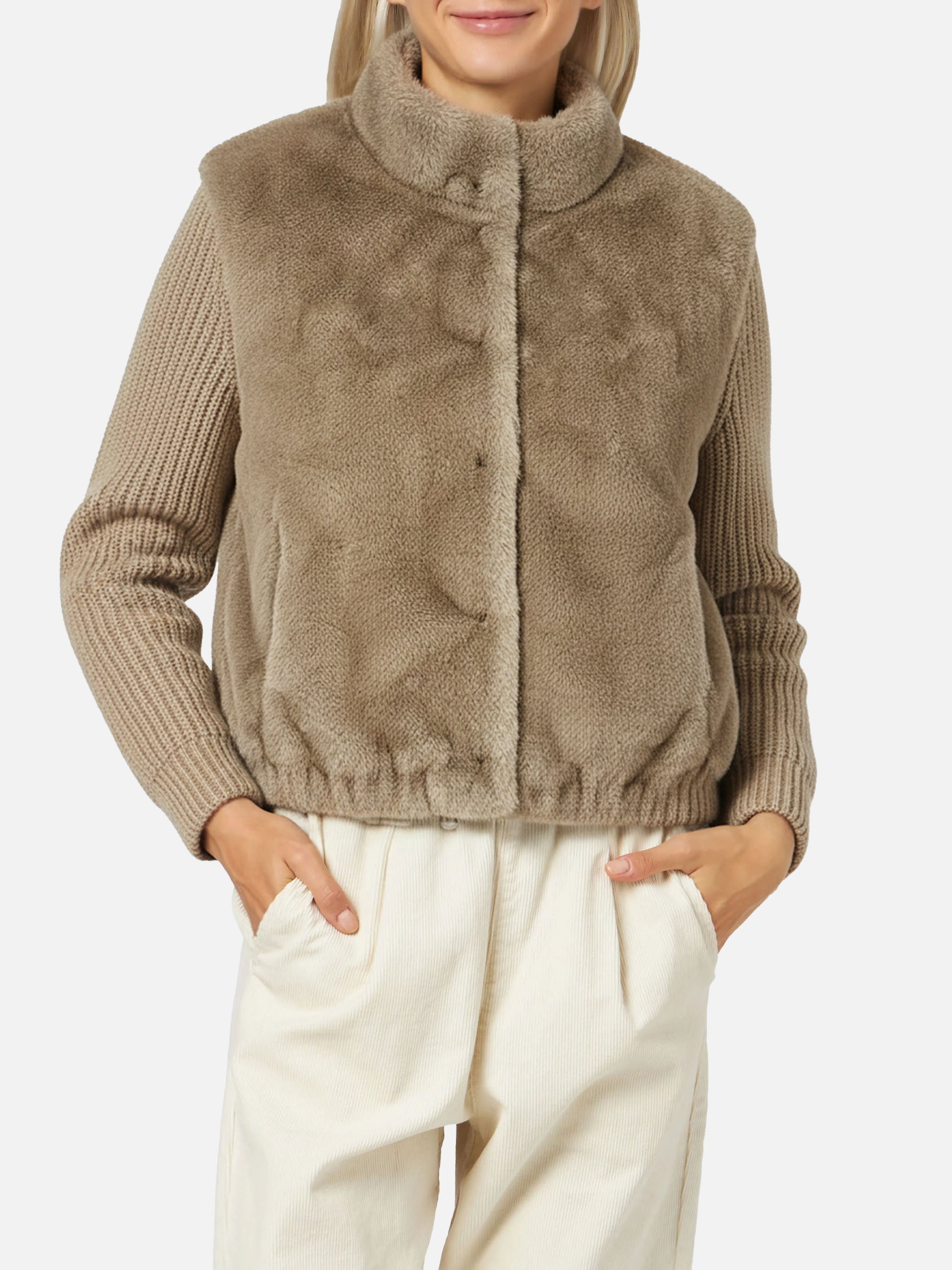 Details: Kontrast zwischen Strickärmeln und Kunstpelzkörper