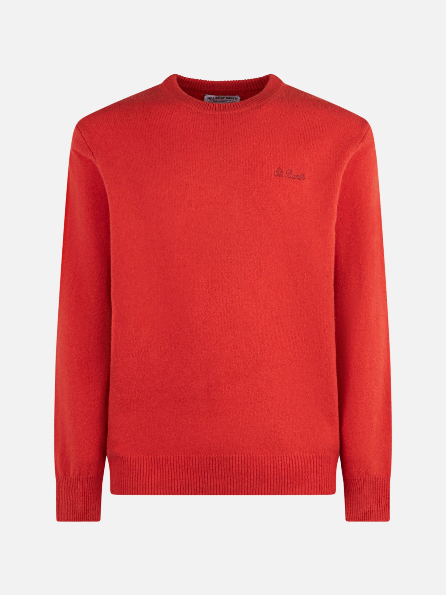 Orangefarbener Herrenpullover mit Rundhalsausschnitt und St. Barth-Stickerei