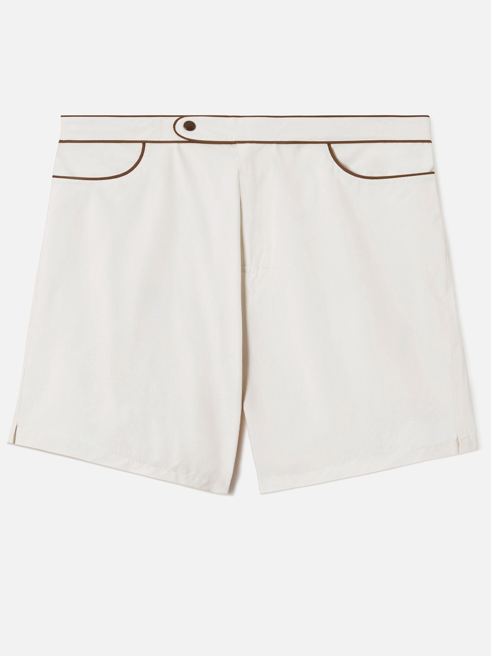 The Master Piping swim shorts are crafted from lightweight breathable fabric designed to provide comfort and freedom of movement. The solid color base is enhanced by contrasting piping that defines the design with a clean and contemporary look. The construction features a tailored waistband with elasticated back panel and a front fly with zip for a stable and comfortable fit. Functional details such as shaped front pockets, a zipped back pocket and the elastic antibacterial inner mesh complete the style, enhancing practicality and breathability.