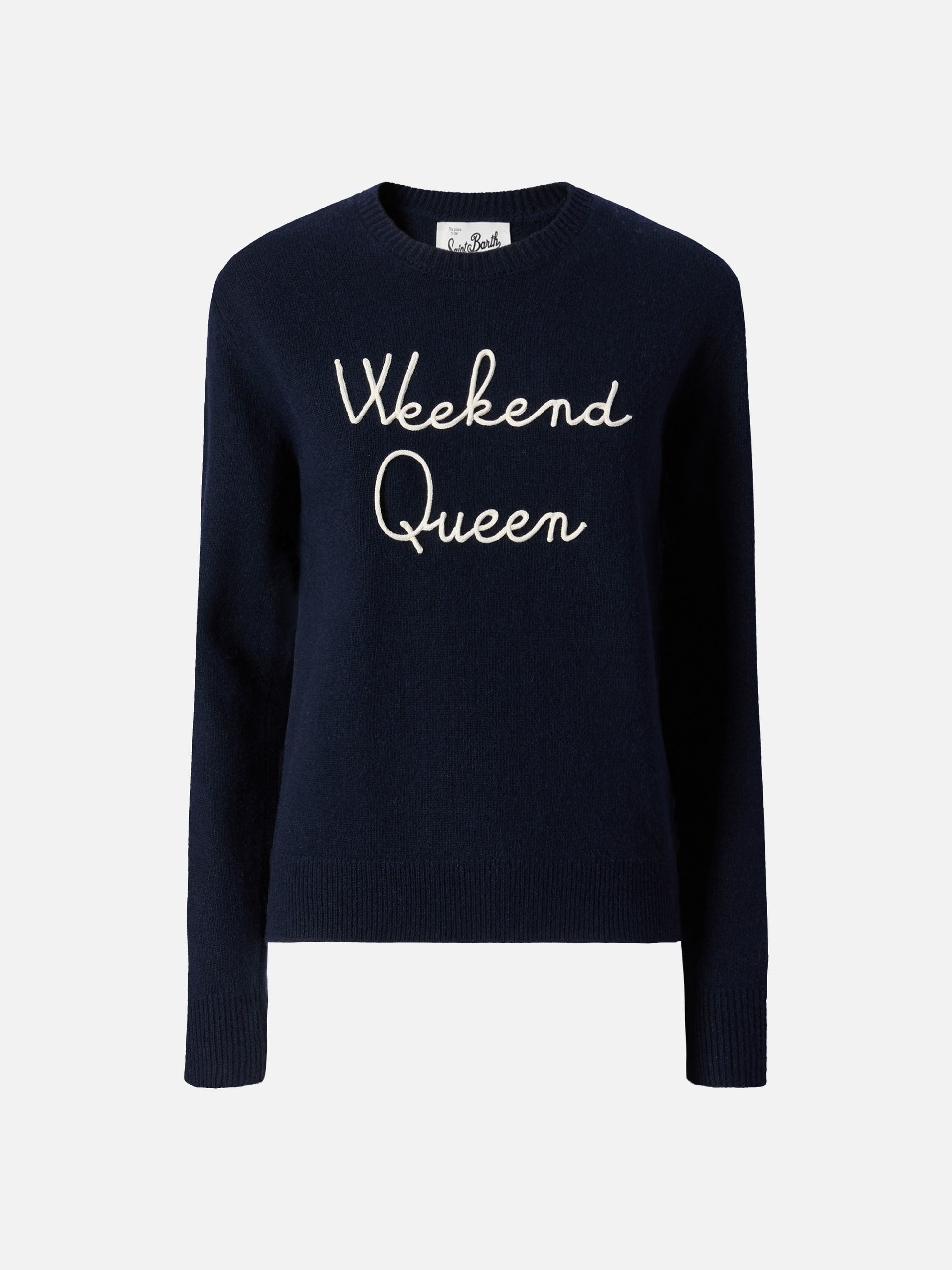 Neuer blauer Queen-Pullover aus Kaschmirmischung mit Weekend Queen-Stickerei