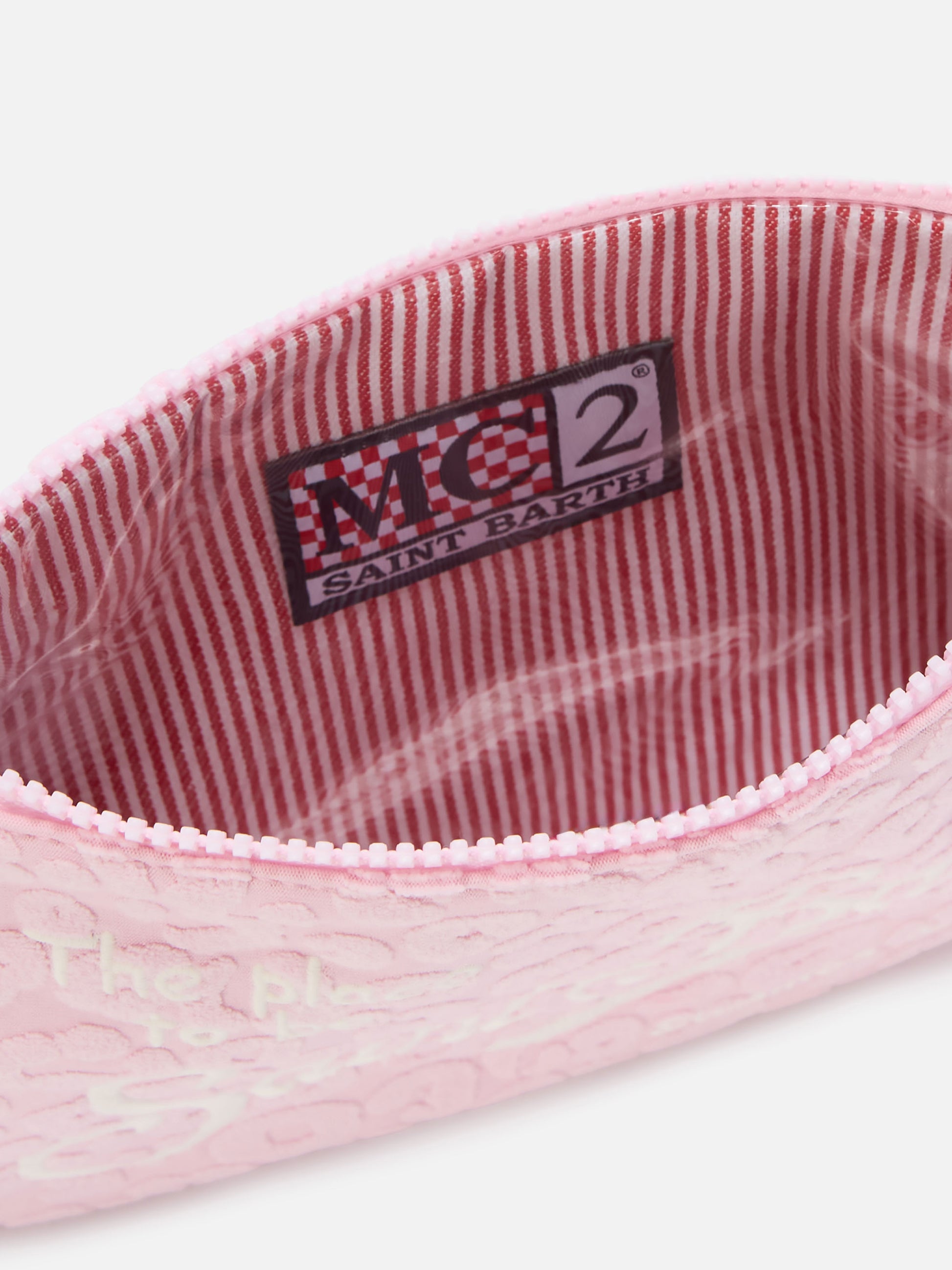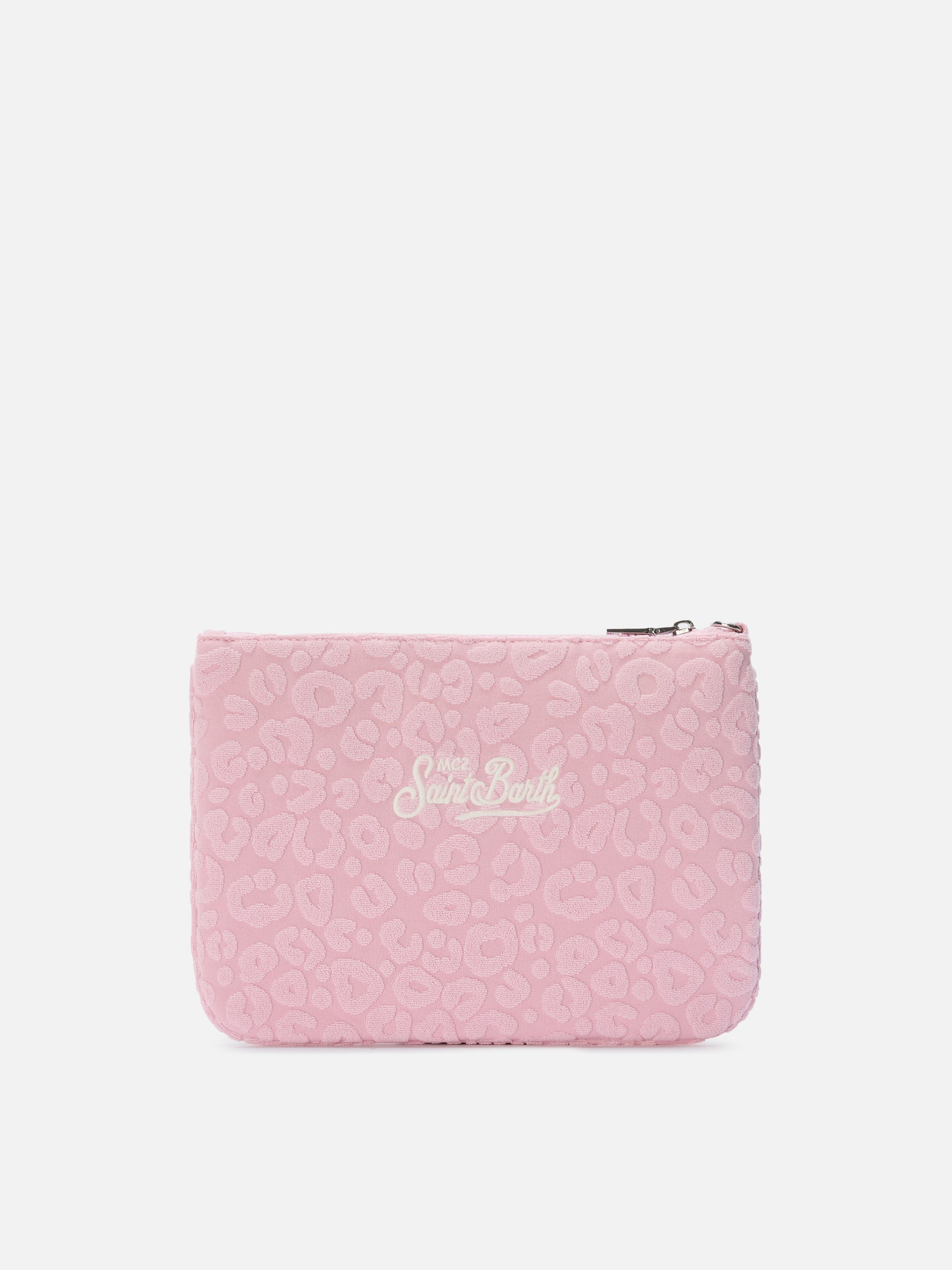Parisienne Sponge terry-effect pouch with embossed leopard pattern and removable strap