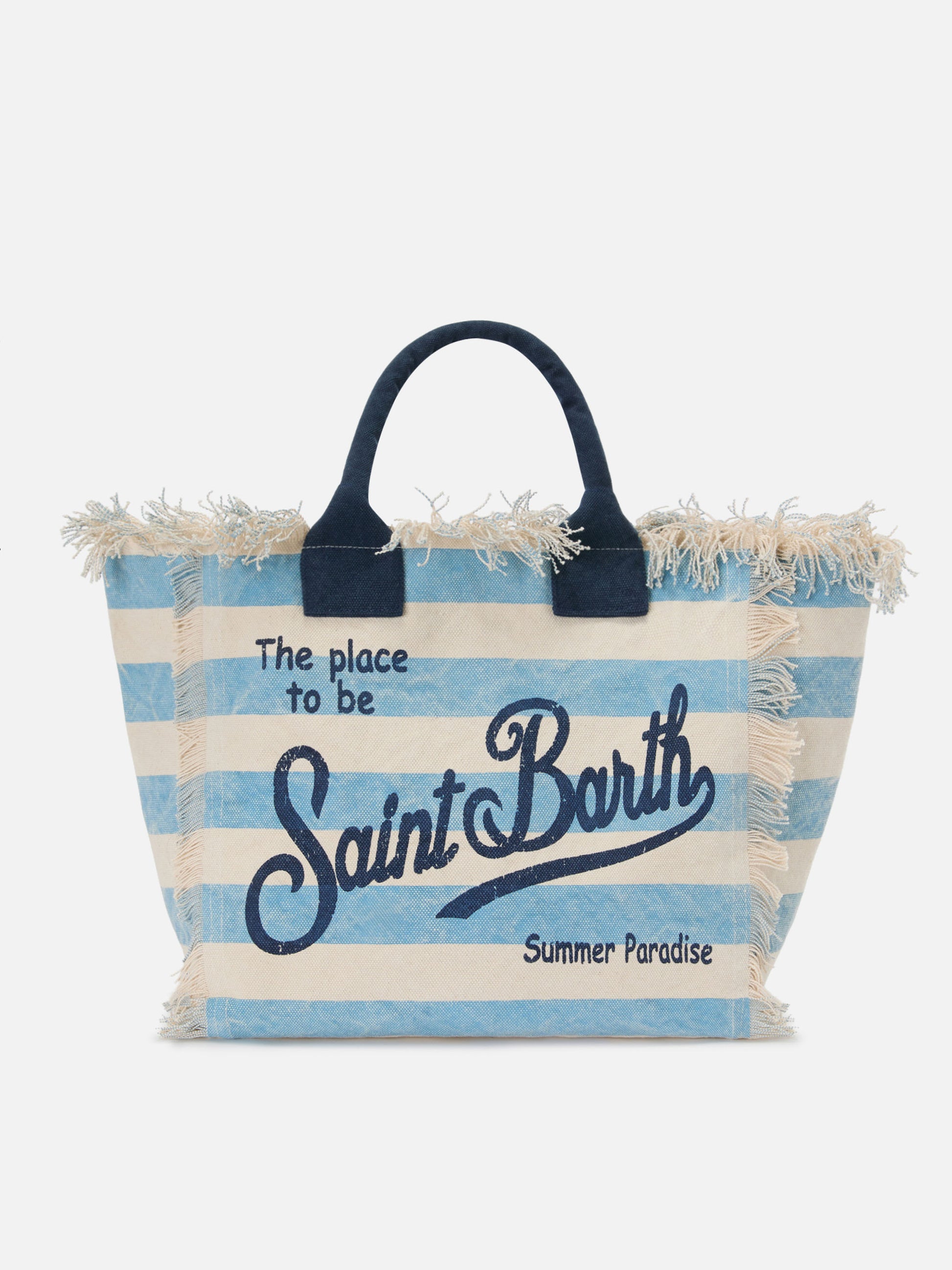 The regular Vanity bag is crafted in canvas with a soft-structured silhouette and horizontal stripe pattern with a fresh and contemporary attitude. Fringes on the sides and along the top edge add movement, while the printed logo on the front completes the design with a distinctive graphic detail. Spacious and practical, it features a top zip closure and an internal pocket to keep essentials organized.