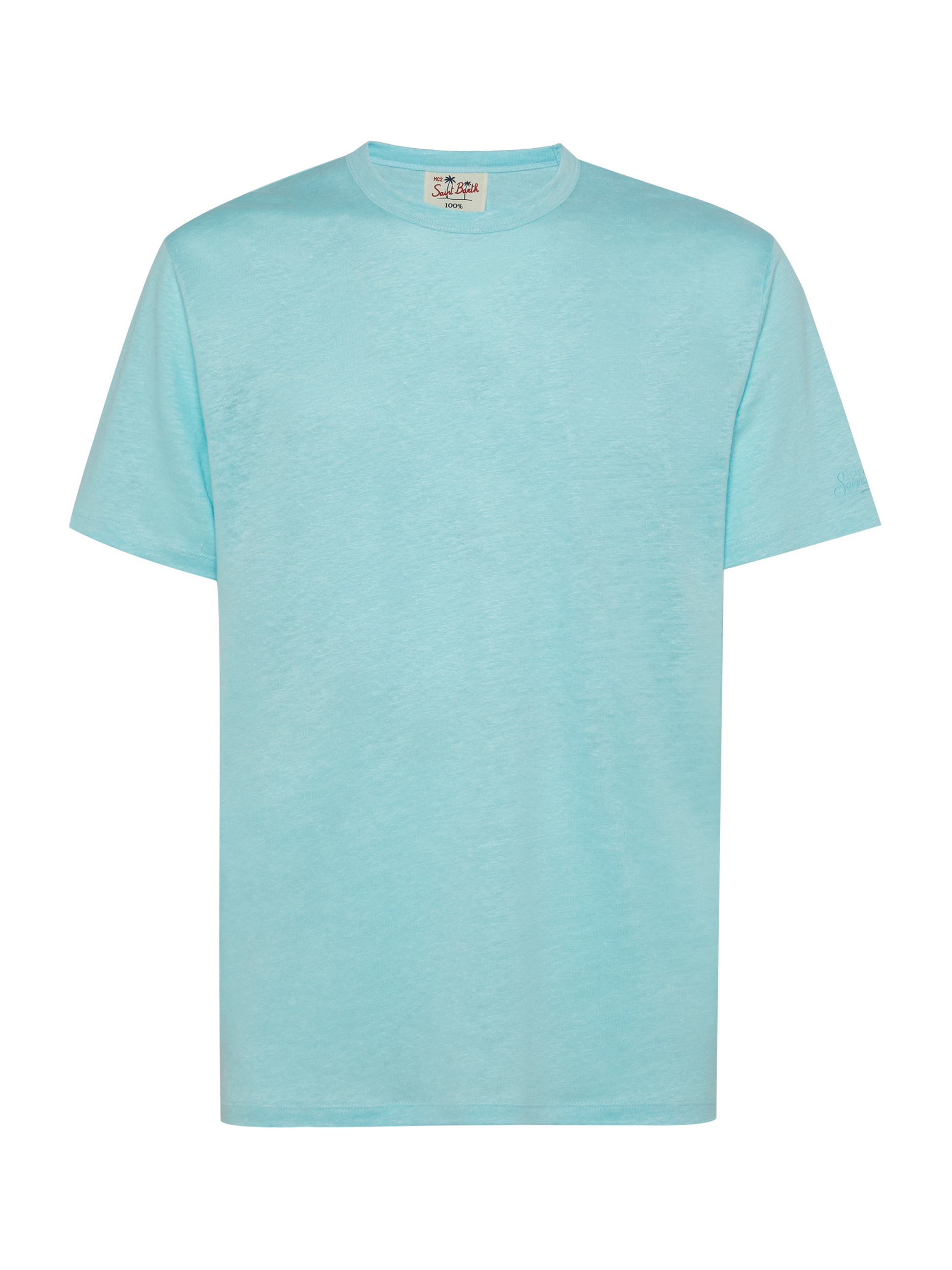 Herren-T-Shirt aus Leinenjersey mit Tasche Wassergrüne Unifarbe Exklusive MC2 Saint Barth Logo-Stickerei auf dem Ärmel Rundhalsausschnitt Kurze Ärmel Normale Passform Größe L hat eine Brustweite von 54,5 cm (vorne und hinten) und variiert bei jeder Größe um 2,5 cm; Schulterbreite von 45 cm und variiert bei jeder Größe um 2 cm; Länge von 71 cm und variiert bei jeder Größe um 2 cm Bitte beachten Sie, dass alle angegebenen Maße ungefähre Angaben sind und aufgrund manueller Messung eine Toleranz von 1-2 cm aufweisen. Dieser Toleranzbereich ist normal und zu erwarten. Das Model ist 185 cm groß und trägt Größe L Zusammensetzung 100% Leinen