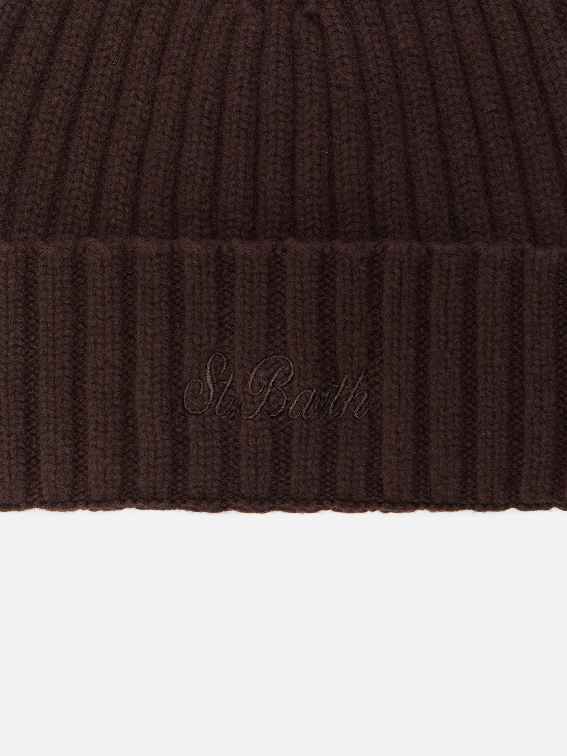 Wengen beanie in brown wool with St. Barth embroidery on the turn-up