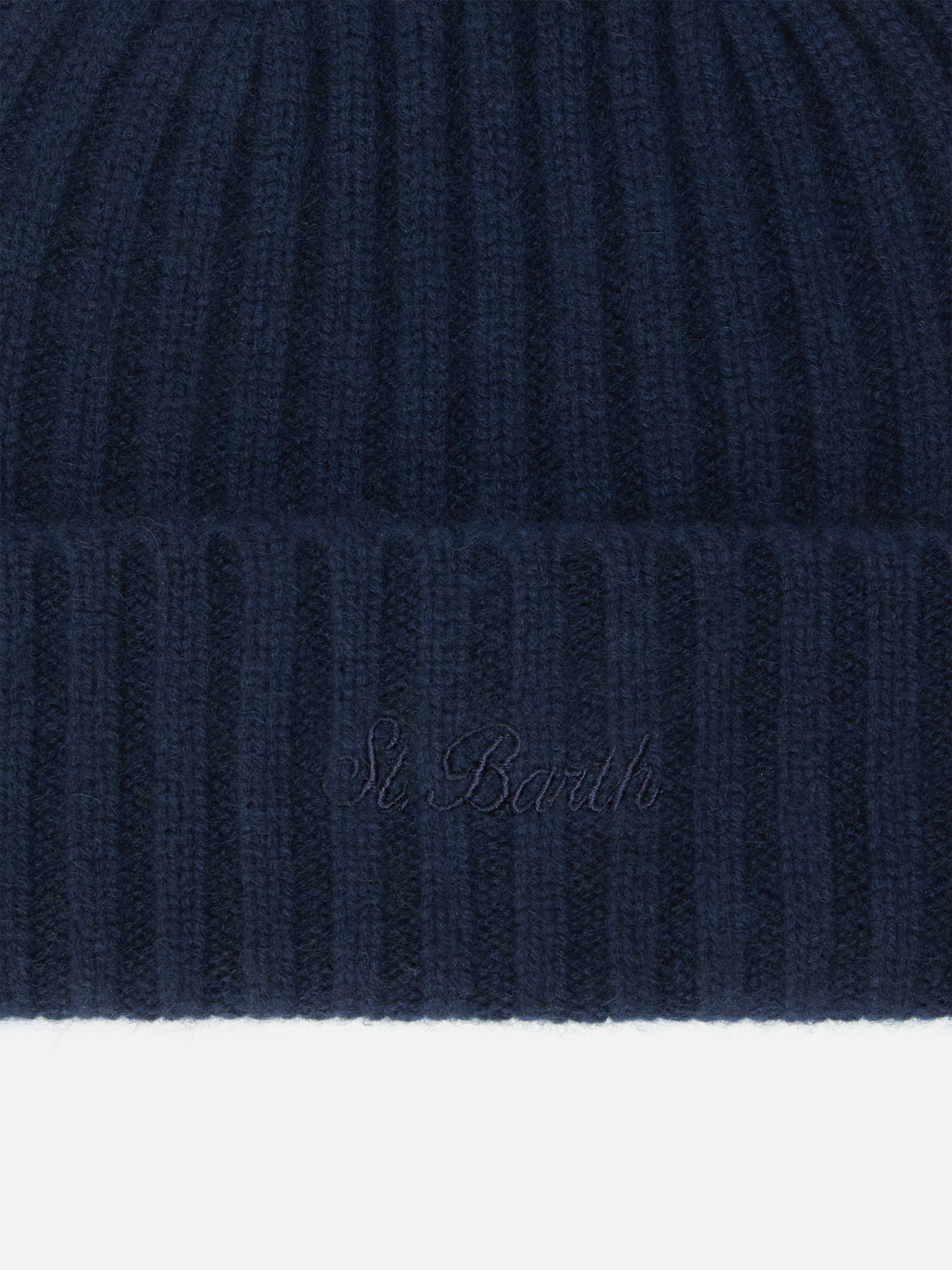 Wengen-Mütze aus Kaschmir in Marineblau mit St.-Barth-Stickerei am Umschlag