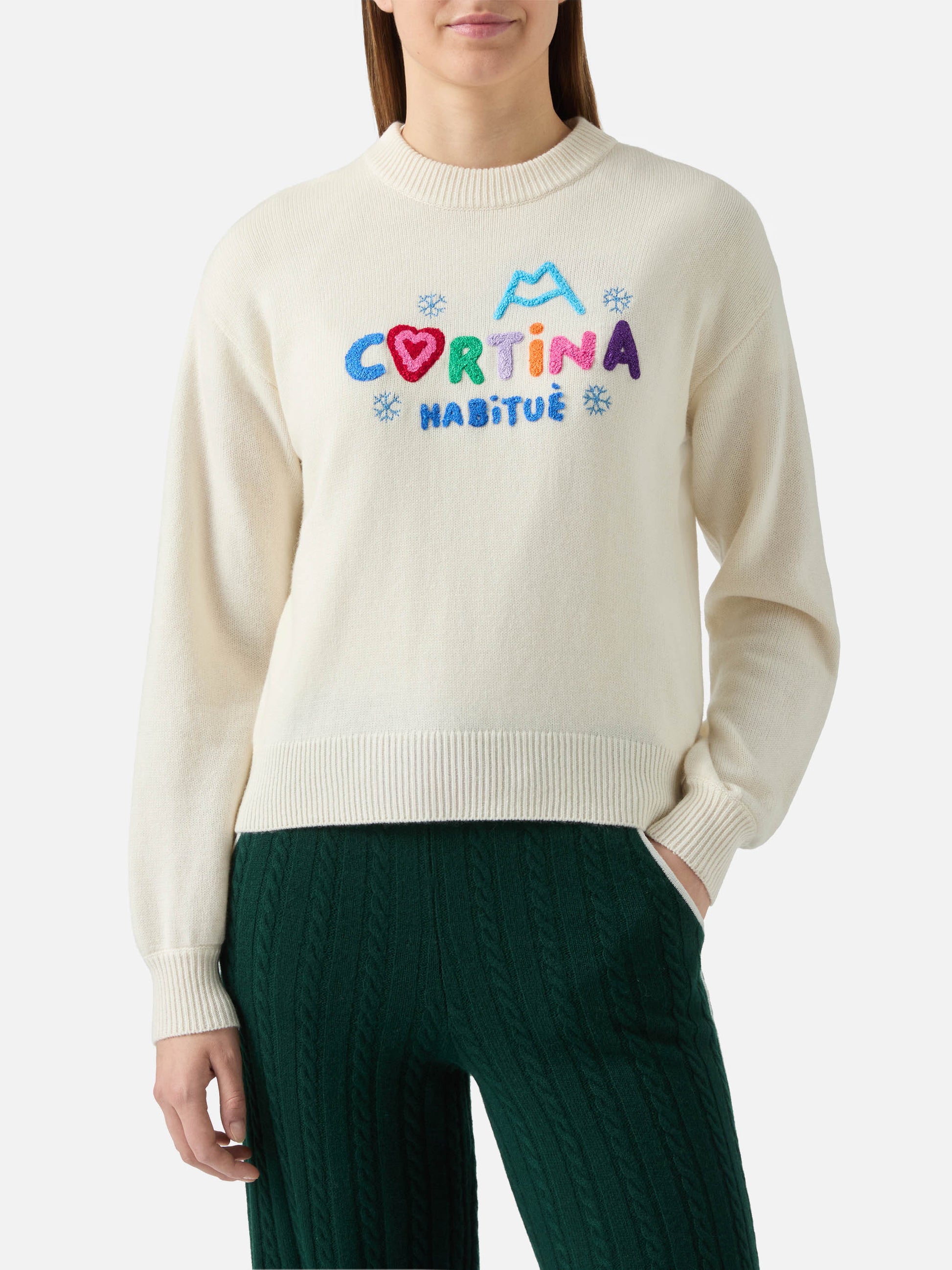 Weißer Danya-Rundhalspullover mit Cortina Habitué-Aufnäher