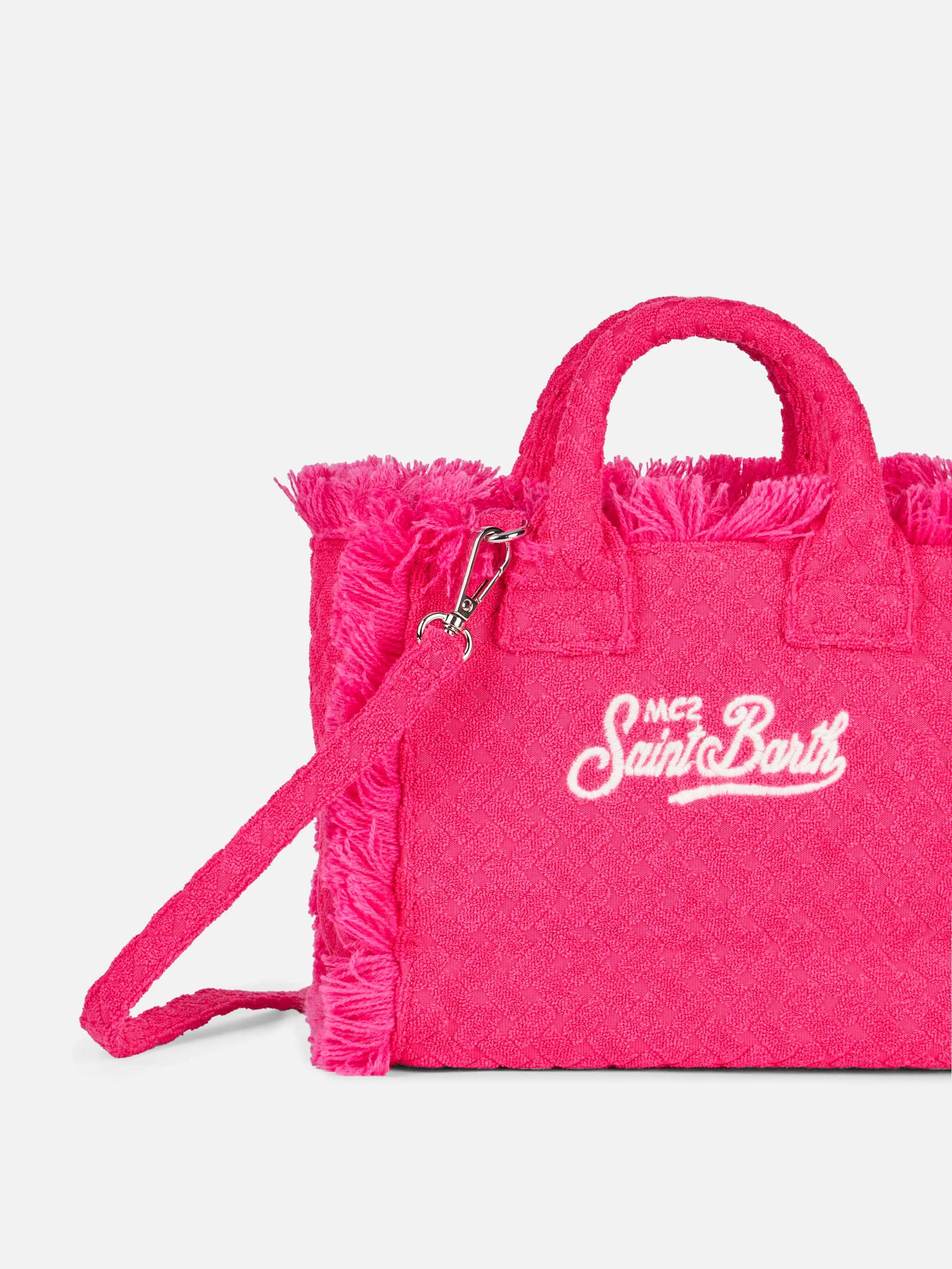 Ti presentiamo la nostra Mini Vanity Sponge Bag, un accessorio chic che armonizza comfort ed eleganza. Realizzata meticolosamente con materiale spugnoso di prima qualità, questa borsa presenta una struttura raffinata per un aspetto sofisticato. Con le sue dimensioni compatte, raggiunge l'equilibrio ideale tra praticità e stile. La borsa è dotata di tracolla rimovibile, che offre opzioni di trasporto versatili su misura per le tue preferenze. Nonostante le sue dimensioni più ridotte, la Mini Vanity Sponge Bag vanta un interno spazioso, che la rende la compagna perfetta per varie occasioni. Disponibile in una vasta gamma di colori, questo capolavoro in miniatura ti consente di esprimere il tuo stile unico senza sforzo. Scegli tra una gamma di tonalità per completare il tuo outfit e fare una dichiarazione ovunque tu vada. Migliora la tua collezione di accessori con questa mini borsa in spugna raffinata e versatile, che unisce perfettamente moda e funzionalità. Mini borsa Vanity Sponge Tessuto goffrato ad onde fucsia Ricamo esclusivo logo Saint Barth Con tracolla removibile Chiusura con cerniera Tasca interna con cerniera Dimensioni: 18 x 16 x 9 cm