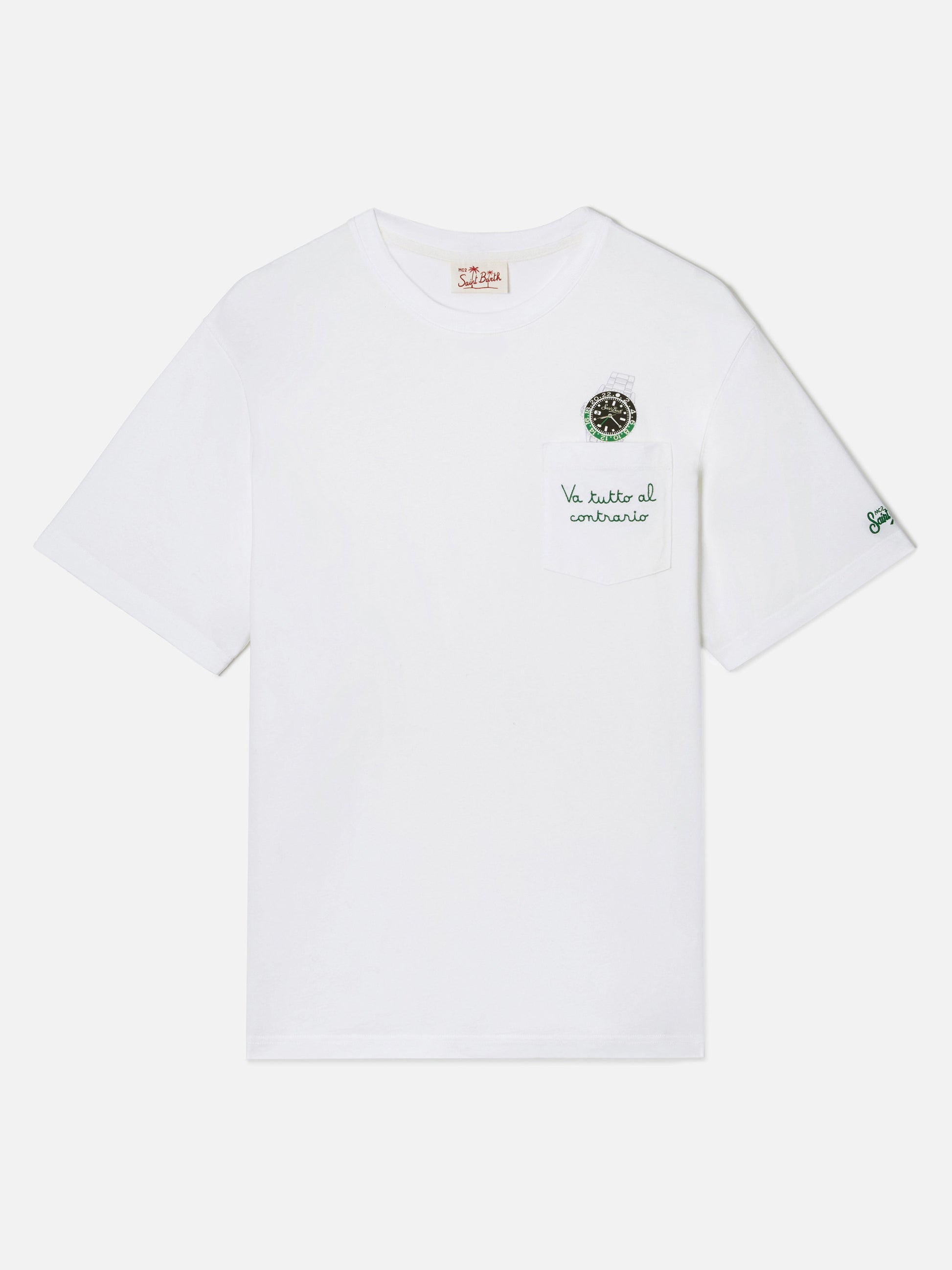 T-shirt Austin bianca con orologio e ricamo Va Tutto Al Contrario