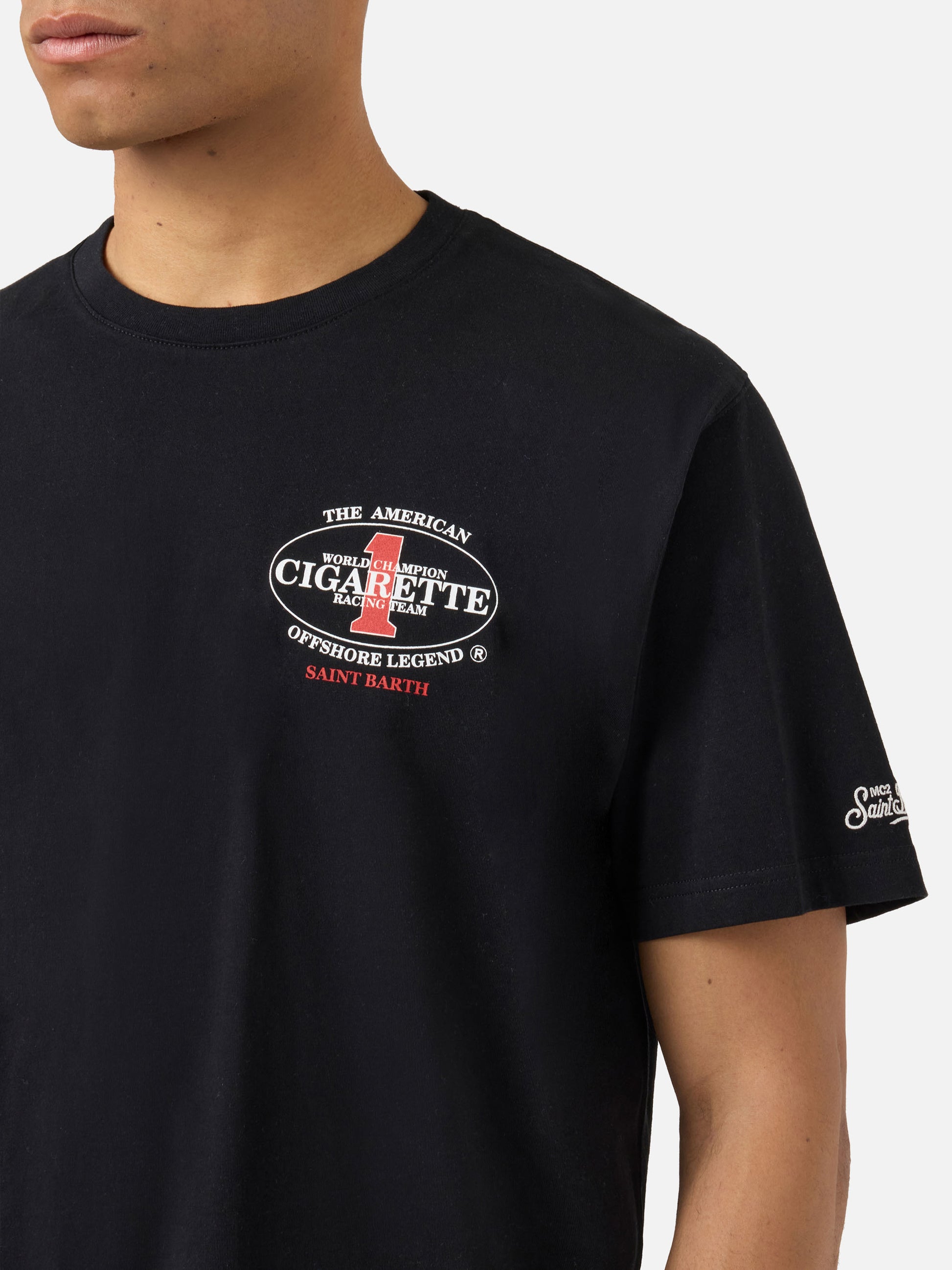 https://it.mc2saintbarth.com/products/black-portland-t-shirt-with-cigarette-racing-print-special-edition10777979814234Black Portland t-shirt with Cigarette Racing print | Special Edition125.00https:files/UID_PRL000207772L-MAN-T-SHIRT-BLACK-MC2-CIGARETTE-20260410170927_2.jpghttps:files/UID_PRL000207772L-MAN-T-SHIRT-BLACK-MC2-CIGARETTE-20260410170927_2.jpgEURInStockT-SHIRT650948215130All Products - Only Man649134276954AVADA - Best Sellers672847102298Cigarette673823621466Man Maxi Print T-shirts288164774072Man T-shirts673818575194Man t-shirts673853800794Men Prints and Embroidery654690484570UpSelling_Man_T-shirtsThe Portland t-shirt is crafted from pure cotton, designed to provide comfort and a natural feel against the skin. The solid black design highlights the essential construction of the garment. In Cigarette Racing Special Edition, the style features a logo print on the chest, while the back is enriched with a large graphic featuring the Cigarette Racing Team logo and Offshore Legend Saint Barth lettering. The garment is completed with logo embroidery on the sleeve, a crew neck, short sleeves and a straight silhouette with regular fit.