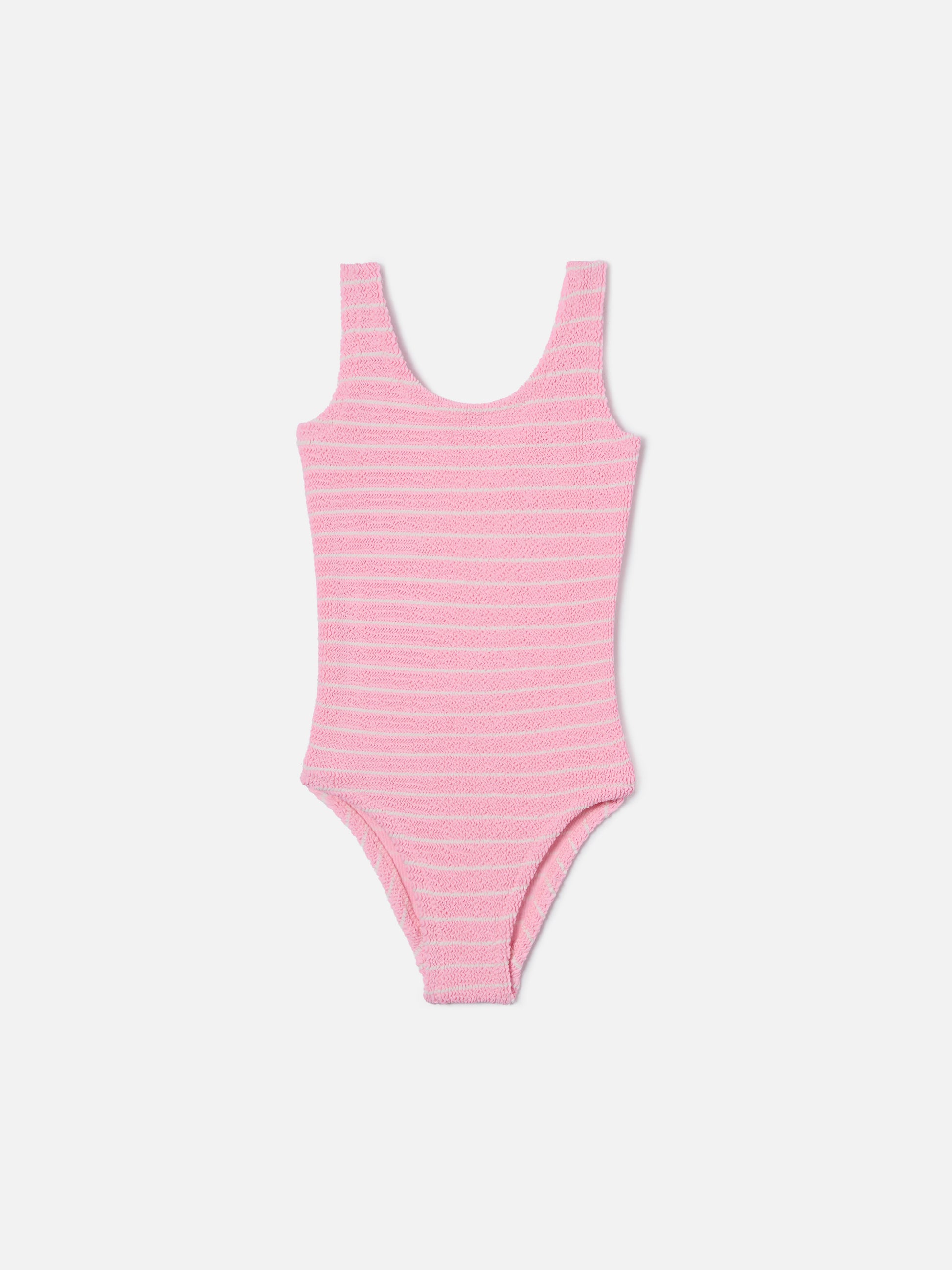 The Cara one-piece swimsuit is crafted in stretch crinkle fabric and features a textured surface with pink and white stripes. The design includes a round neckline and wide straps for a stable and comfortable fit. The fitted silhouette ensures comfort.