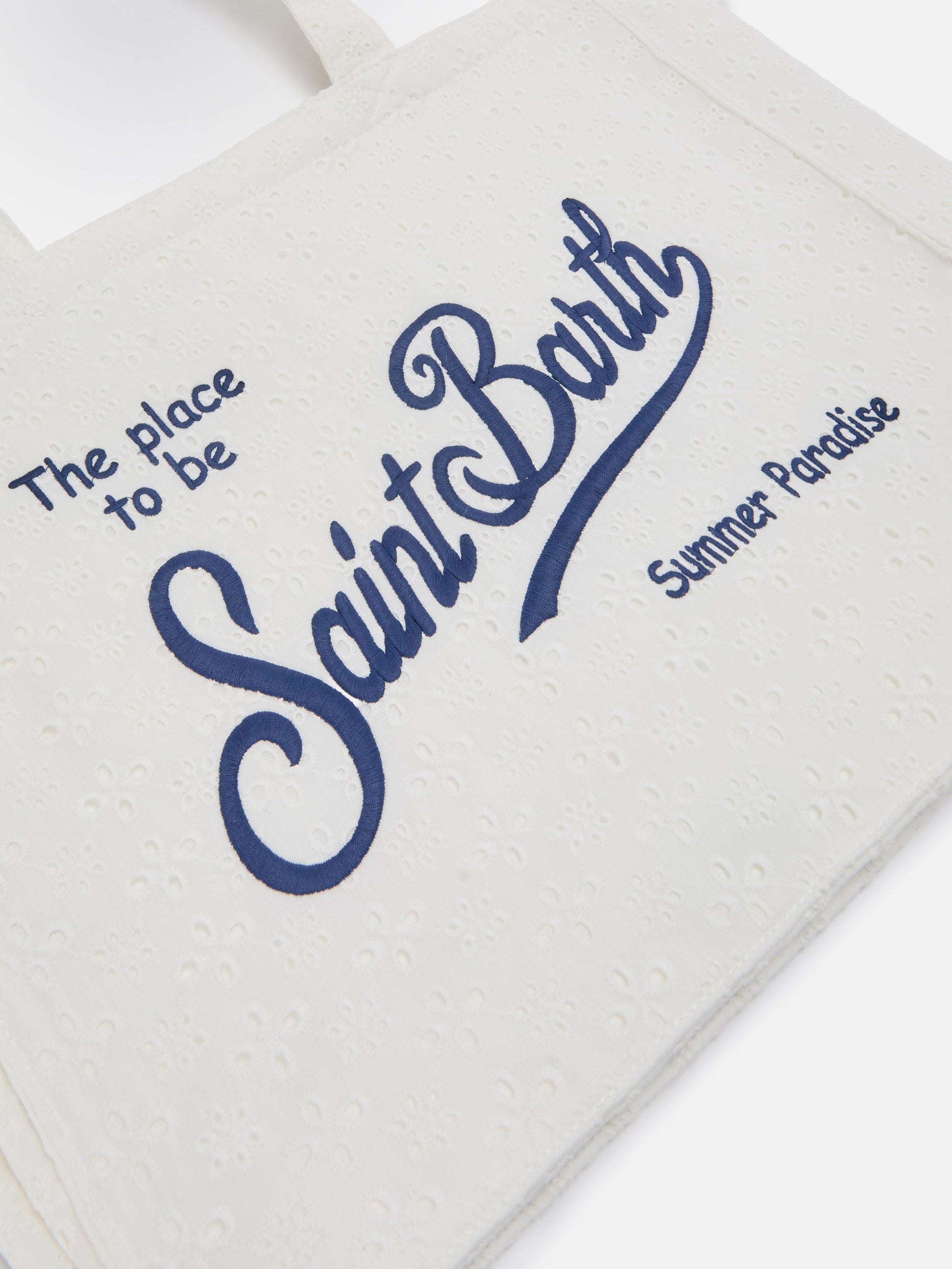 Essential white broderie anglaise cotton tote bag with contrasting logo