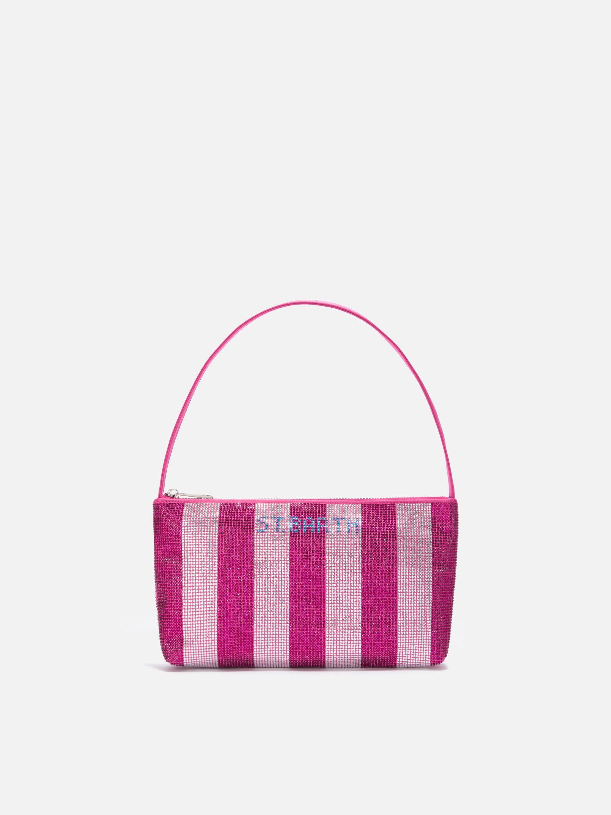 Add a touch of glamour to your look with this mini bag adorned with shimmering pink and silver rhinestones. Featuring a sleek satin handle and the iconic Saint Barth logo, it’s the perfect statement accessory for elegant evenings or special occasions.