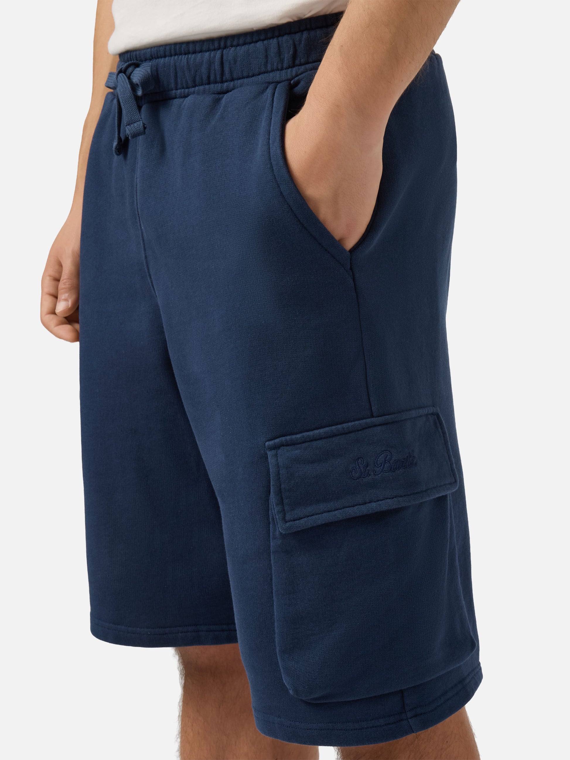 Introducing the Cargy cargo shorts for men. With its 5-pocket design (2 slit pockets on the front upper part, 2 applied pockets on the front lower part, 1 inserted on the back right side), these cargo shorts are both functional and stylish. Crafted from 100% cotton fleece fabric, they offer comfort and durability. Featuring a weight of 250 grams and garment-dyed finish, they have a loose fit that stays true to size. The embroidered St. Barth logo detailing on the lower left pocket adds a touch of sophistication, while the centered MC2 Saint Barth logo label on the back waistband completes the look.