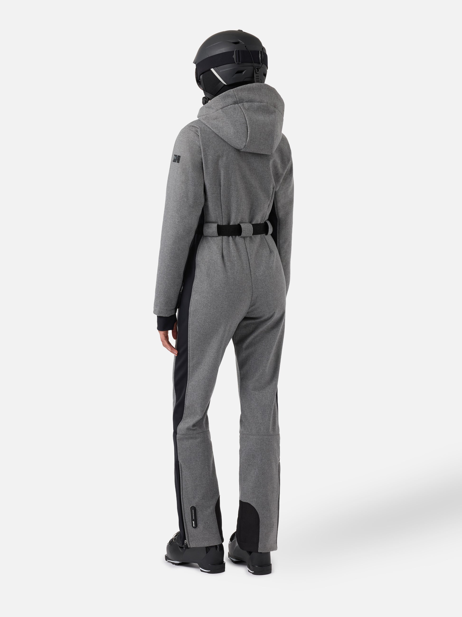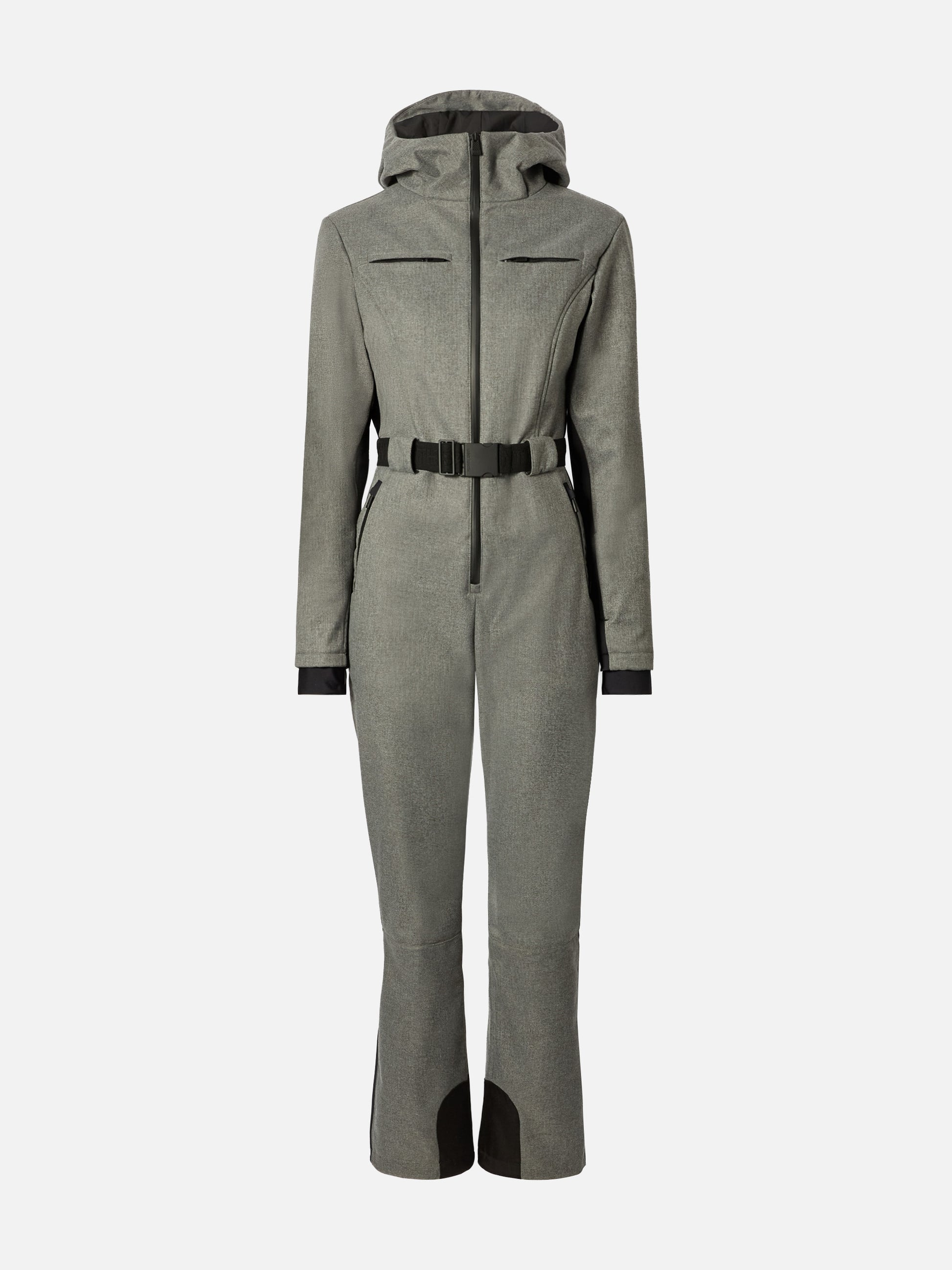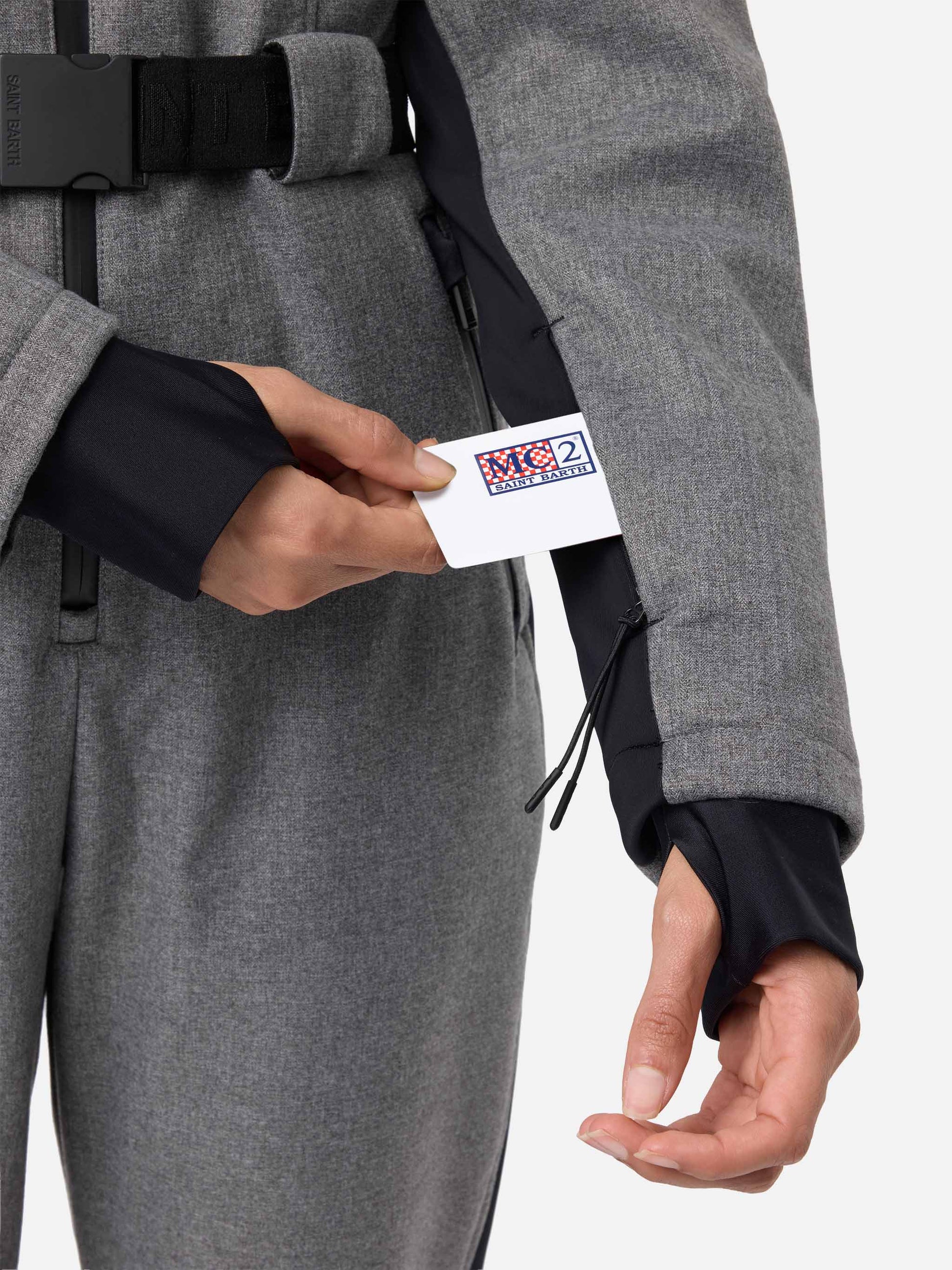 The woman Garmisch ski suit is a technical and elegant garment designed to deliver high performance on the slopes without compromising on style. Engineered to provide comfort, protection, and freedom of movement, it is ideal for skiers who want to tackle extreme conditions with confidence and class. Made from high-quality waterproof and breathable materials, it offers complete protection against cold, wind, and moisture, keeping the body warm and dry. It features an ergonomic and form-fitting design, tailored to follow the body's movements during sports activities. The seams are reinforced and strategically positioned to ensure maximum durability and resilience, even in the most challenging conditions. Ski suit in grey plain color MC2 logo on the sleeve Hood High collar with front zipper extending from the hip level to above the collar Two welt pockets at chest height Two zippered pockets Belt loops Saint Barth branded belt Regular fit Composition: 90% Polyester, 7% Polyamide, 3% other fibers