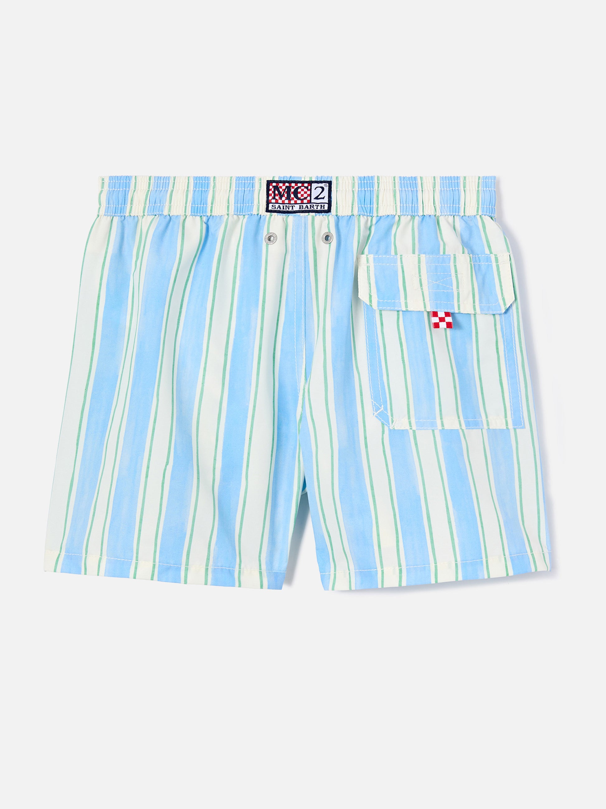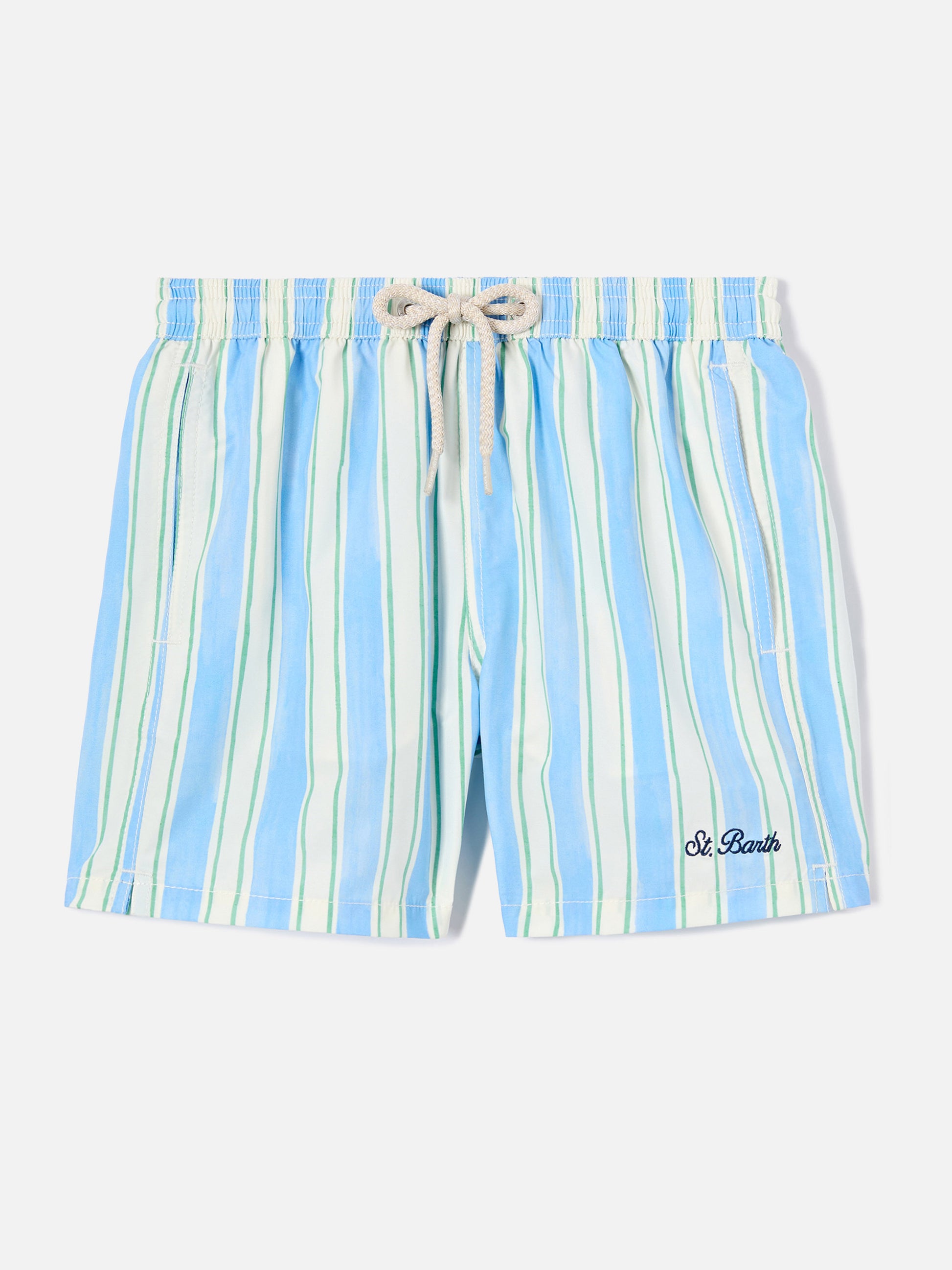 Syros Jr boys swim shorts White, light blue and green Wide striped Contrasting St. Barth embroidery on the leg Breathable quick drying fabric Elasticated waistband with adjustable drawstring Waist drawstring with branded ends Branded metal eyelets Two reinforced side pockets Back patch pocket with flap and velcro closure Puller detail and drainage opening Reinforced side slits Elasticated antibacterial inner mesh with enhanced comfort Nickel free metal accessories Regular fit. Please keep this in mind when selecting your size.