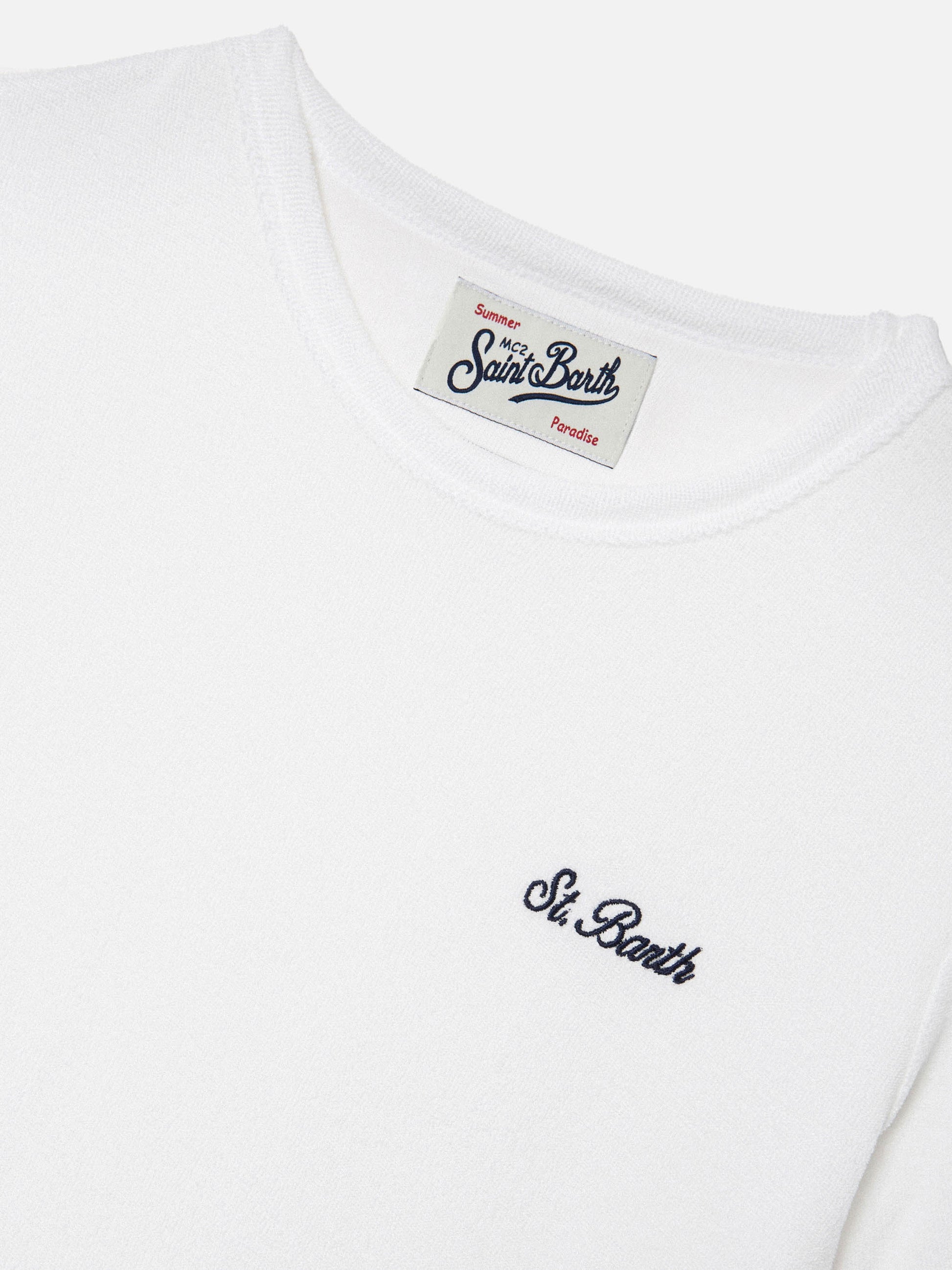 The Gary Jr t-shirt for boys is made of terry-effect fabric, lightweight and comfortable, designed to offer softness and comfort on the skin. The solid white design is defined by tone-on-tone St. Barth embroidery on the chest. The model features a crew neck and short sleeves. The straight line ensures a regular fit.