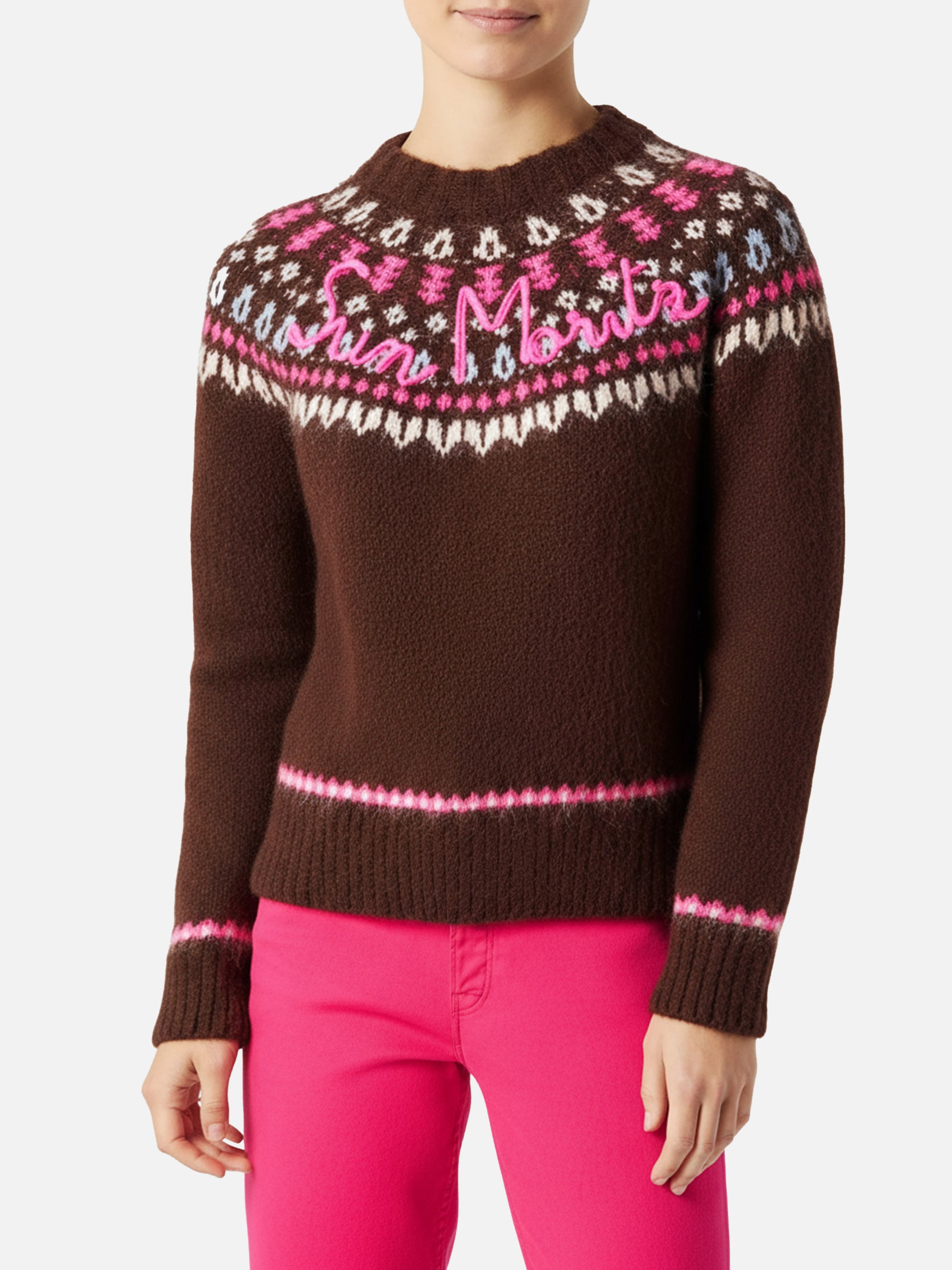 Woman brown crewneck nordic jacquard sweater